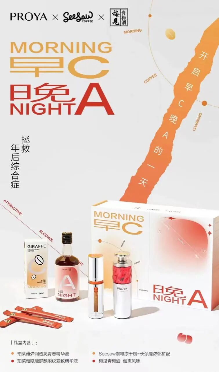 梅见携手Seesaw与珀莱雅推出“早C晚A”礼盒,在打工人繁忙的职场生活之余,提供早Coffee晚Alcohol的体验。礼盒内含2瓶珀莱雅精华液、1盒Seesaw咖啡冻干粉和1瓶梅见青梅酒。(来源:官方微信公众号)