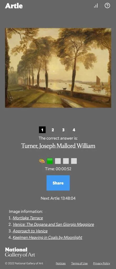 / 美国国家艺术馆(NGA)于近期开发出了一款基于艺术的在线解谜游戏“Artle”,采用了与今年年初爆红的文字解谜游戏“Wordle”相似的玩法与功能设计 / 图源:转自NGA官网