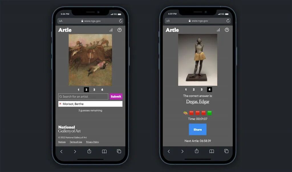其实,这样的设计与玩法不仅在游戏世界里受用,对于那些希望创造出吸引人的、具有社交性的、不断更新的数字体验的文化组织来说,也同样是值得借鉴的。于是,一款与“Wordle”颇有异曲同工之妙的产品便在文化艺术界诞生了——就在近期,美国国家艺术馆(NGA)开发出了一款基于艺术的在线解谜游戏“Artle”,并于 5 月向玩家公布。