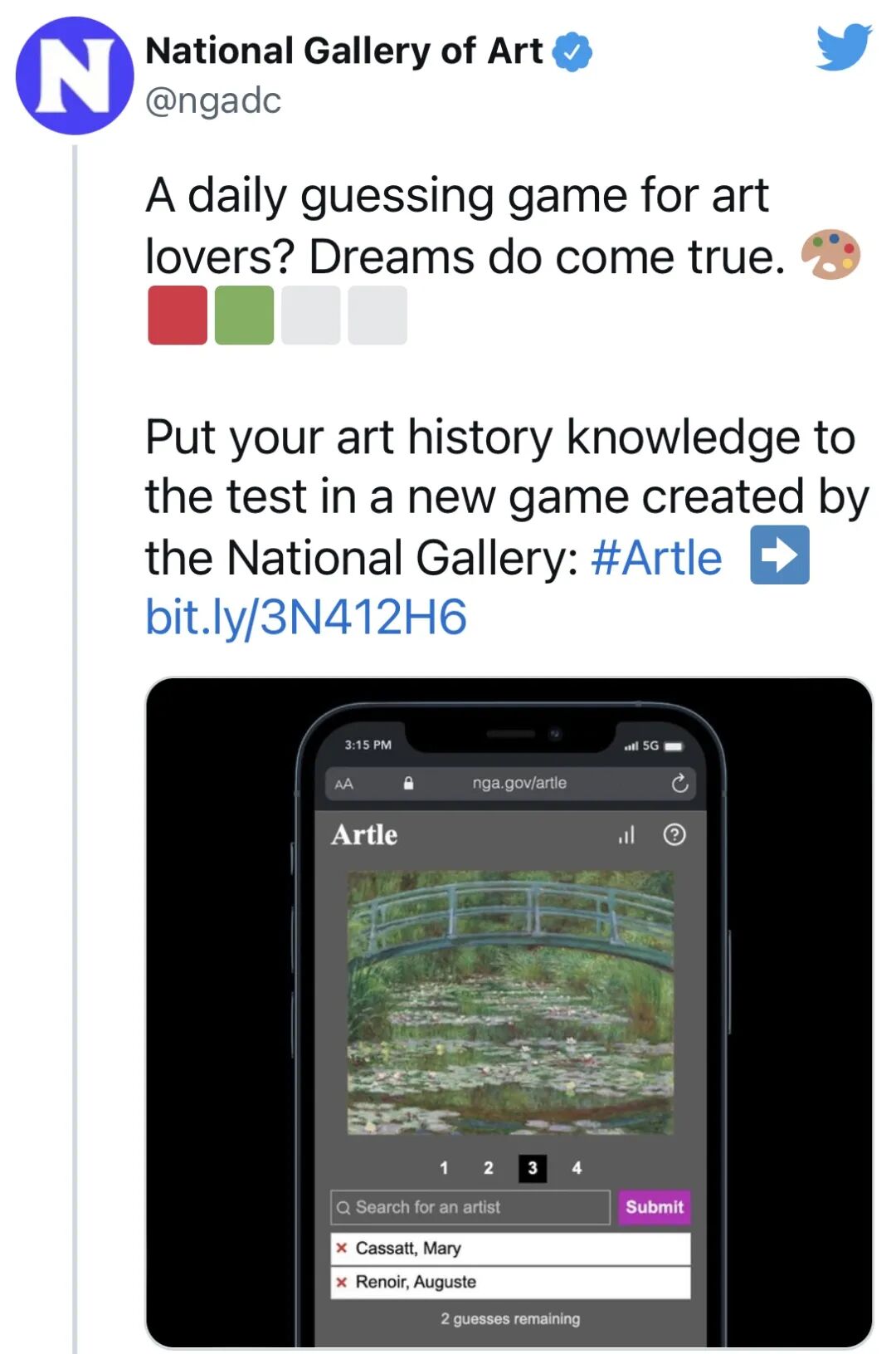 / 图:NGA在推特上发帖,鼓励观众参与“Artle”当日更新的艺术谜题