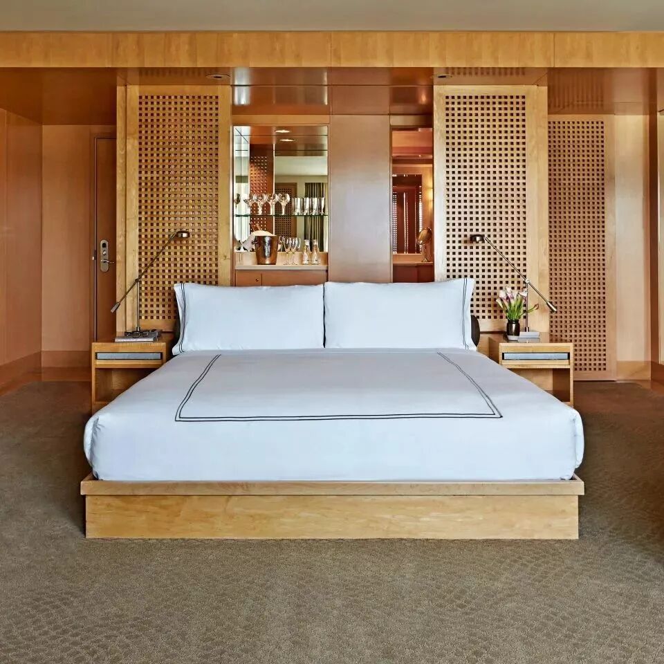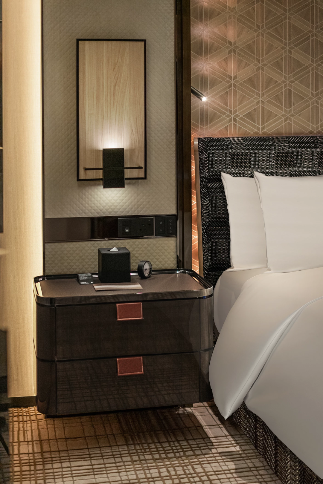 抽屉的皮质把手驱走了传统把手的尖锐感。床头的填充面料和木质折耳镶边,增进了睡眠的包裹感,也关乎了一些住客睡前阅读的斜靠偏好。