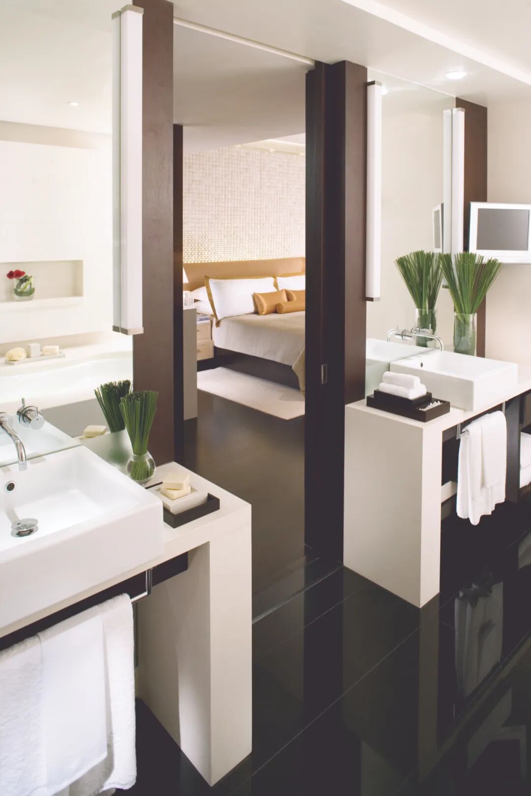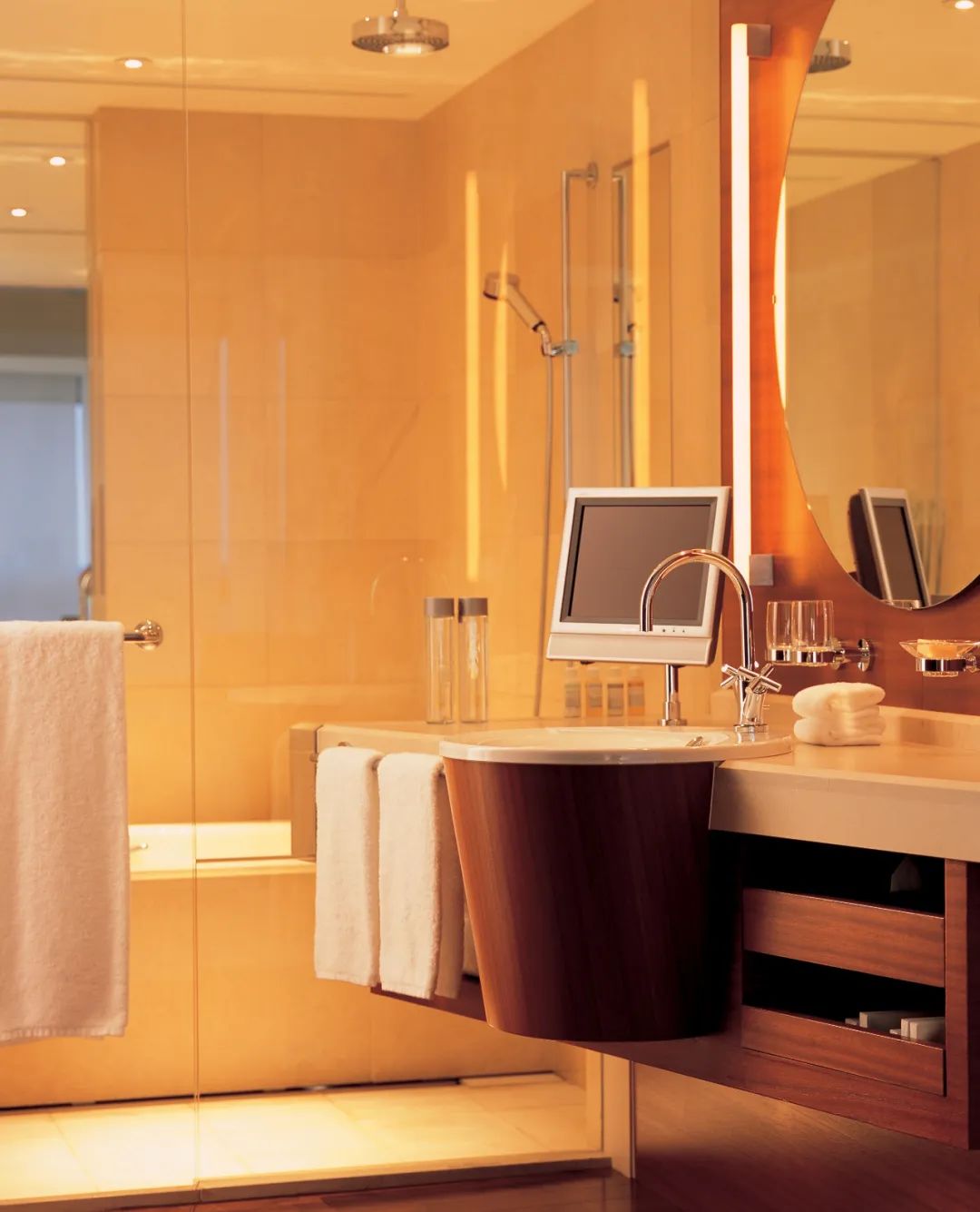 ▲ 受倡导客房大浴室理念的丽晶的影响,Chhada Siembieda从在上世纪80/90年代就偏好动用1/3乃至近乎一半的客房比重打造浴室,引入双台盆、让淋浴坐浴彼此独立。这在酒店浴室憋屈紧凑的当时是让人费解的铺张举动,如今早已成为豪华酒店界的定律。