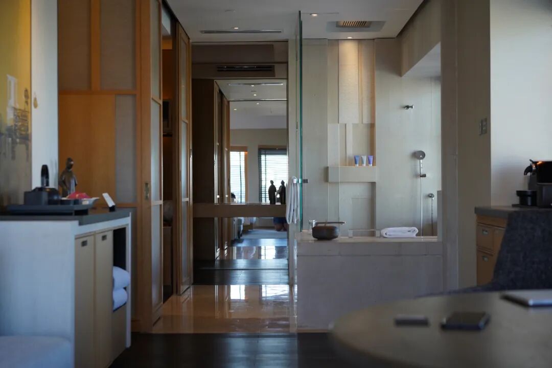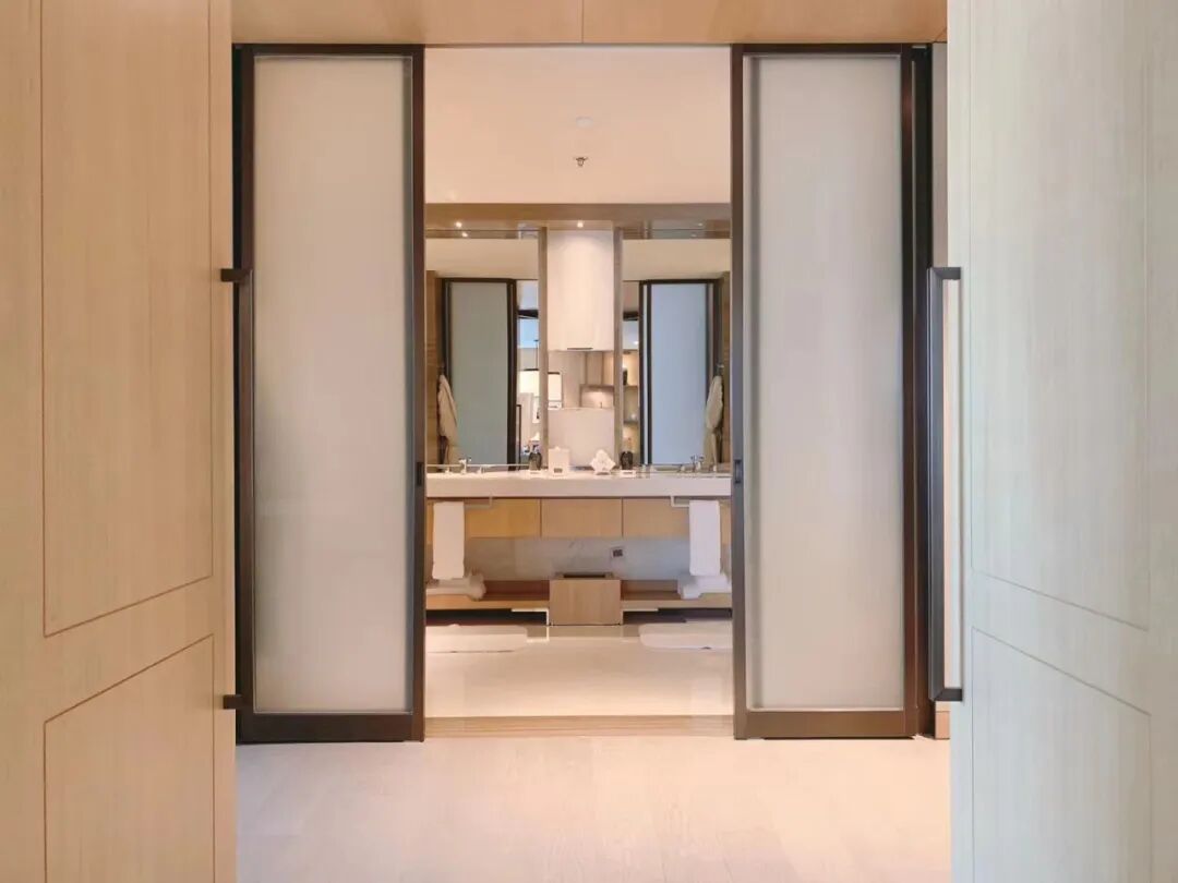 如此处理,既提升了沐浴的畅快感(我就超怕泡完澡再湿答答地推开另一扇门冲淋),也让梳妆过程更从容优雅,还提升了客房的空间感官和休闲度。让城市酒店的客房瞬间有了水疗馆氛围。