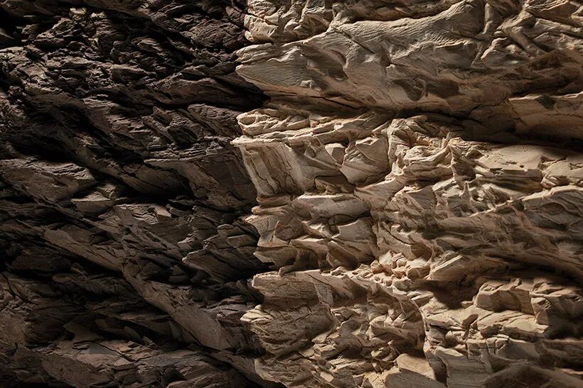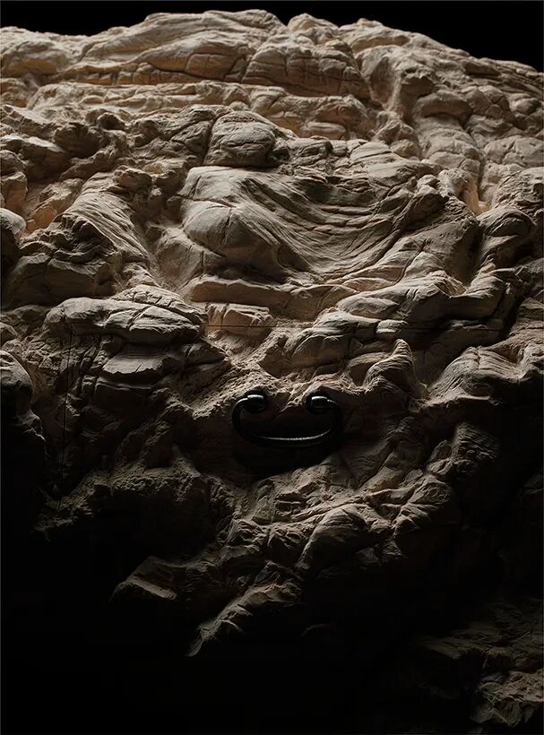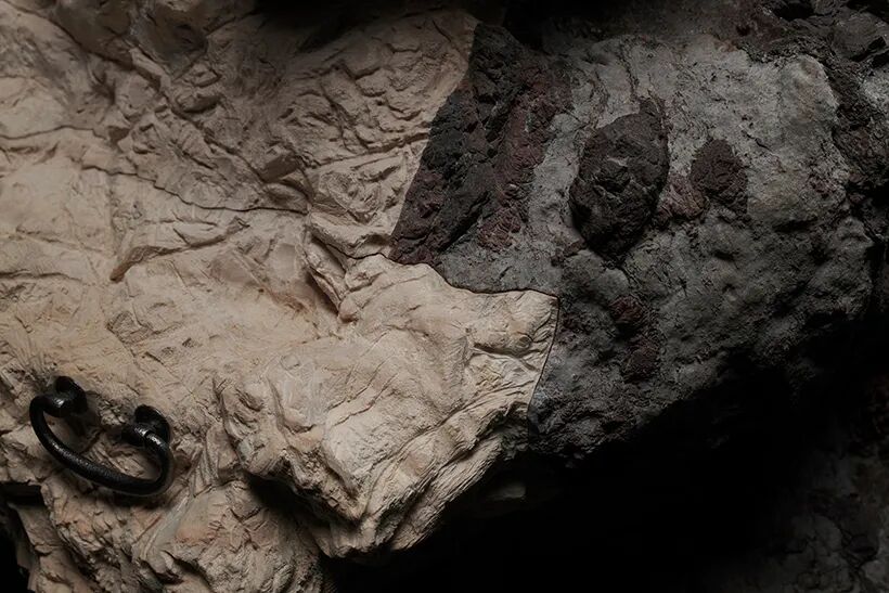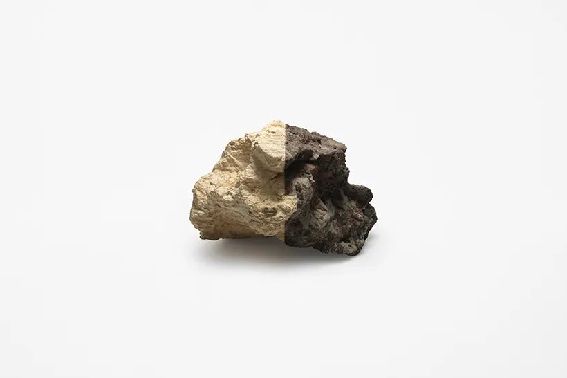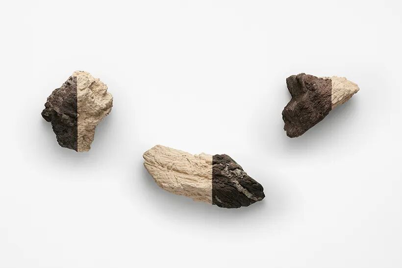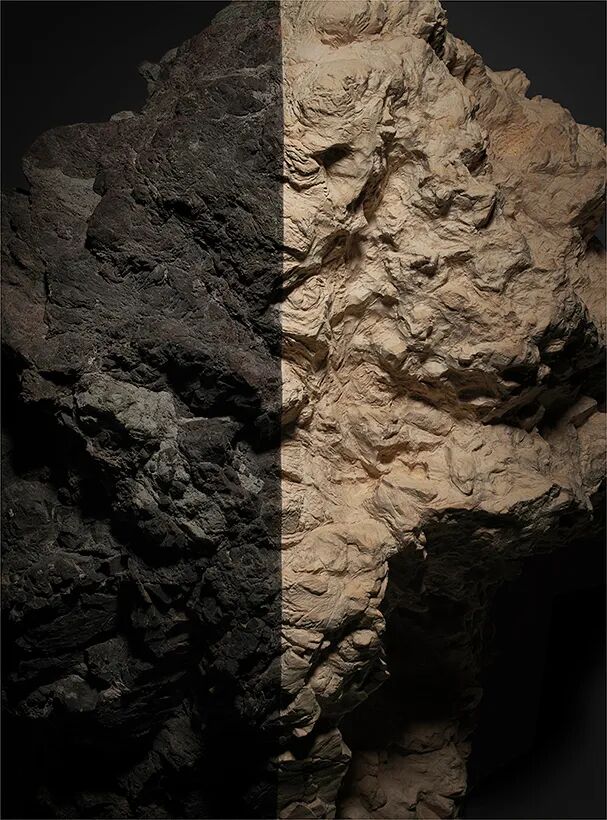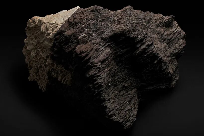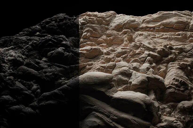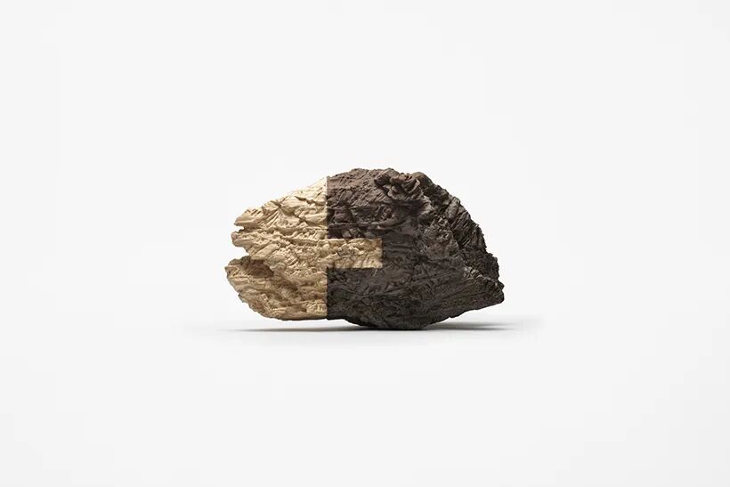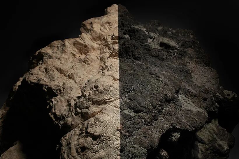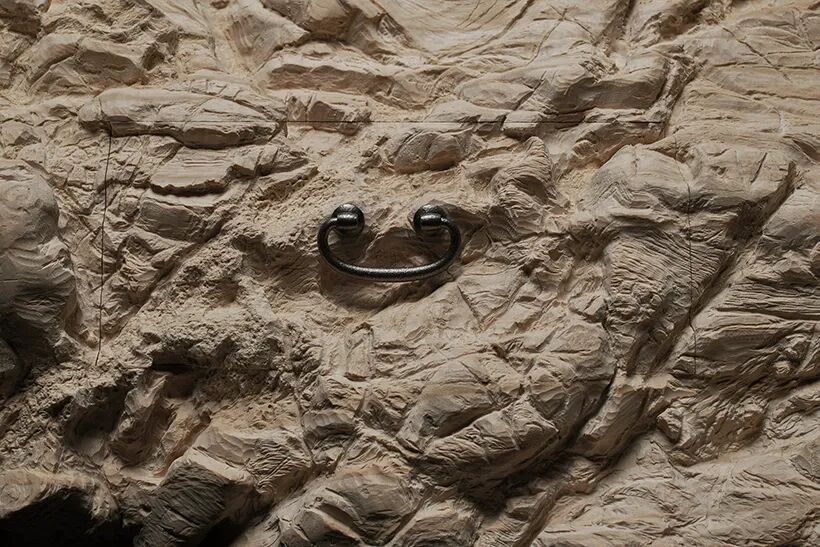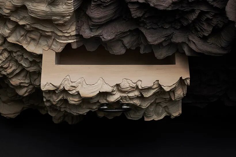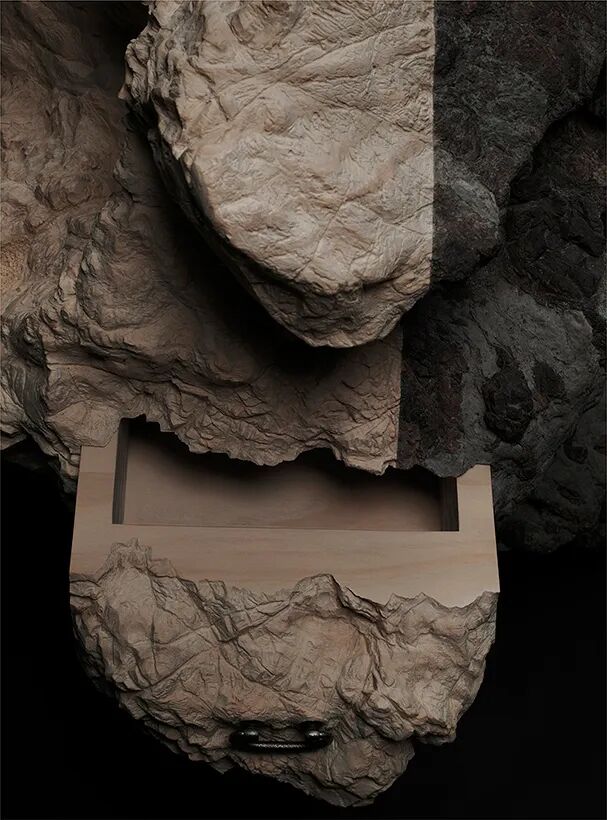 First, Ogawa selected three boulders. Kasukabe stone from Kameoka, Kyoto Prefecture, has a rough appearance with alternating layers of red chert and reddish-purple dolomite. The gnarled, marbled pattern of Niyodo stone from the river Niyodogawa in Kochi Prefecture is quite rare in the stone’s natural state. The other Niyodo stone has the look of a volcanic crater partially overrun with lava. Next, the three boulders were 3D scanned to provide data on which to sculpt a block of radiata pine with a five-axis milling machine and the handiwork of sculptors. Shaped by a variety of tools, including chisels, handheld rotary tools, and sandblasters, the pine was made to perfectly replicate the boulders’ shapes, down to the minute irregularities of their surfaces. Meanwhile, the boulders too went under the knife but of a 60-inch medium-diameter circular saw. However, great care was taken to prevent any chips or cracks, or else the entire process would have had to be redone from scratch. Last, the drawers were processed with a disc grinder and an electric chisel and integrated with the stone and wooden parts.