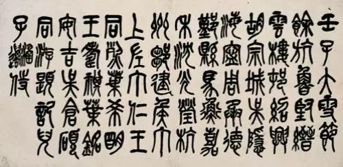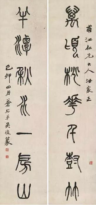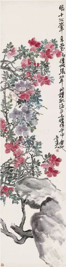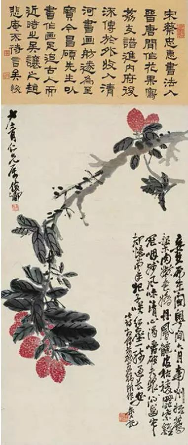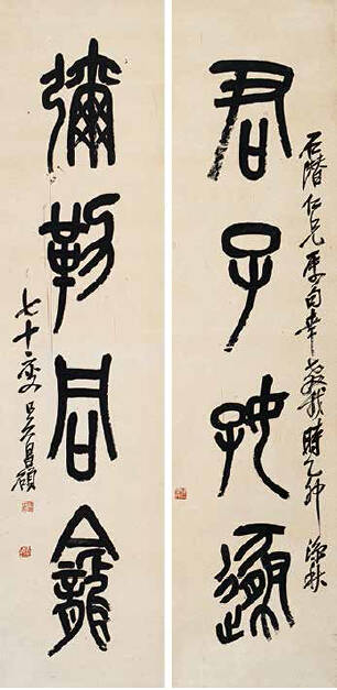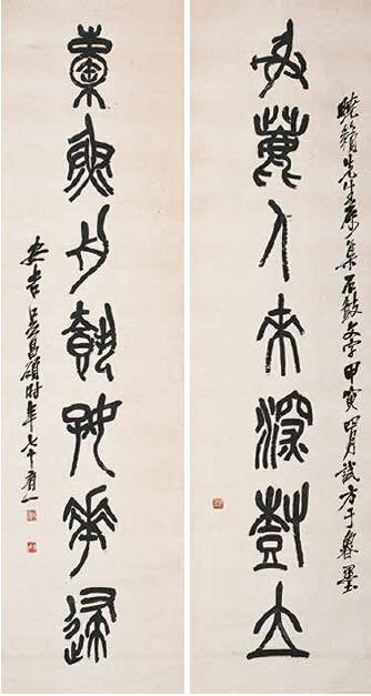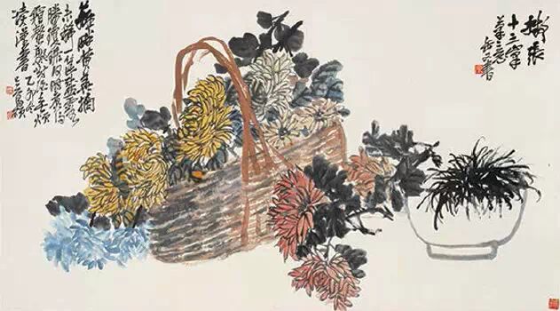 吴昌硕在绘画、书法、篆刻上都是旗帜性人物,在诗文、金石等方面均有很高的造诣。他的书法,脱胎石鼓、自出机杼,形成了格调高古的个人风格,其清刚健拔的金石意味,力能扛鼎的篆籀笔意,沉厚酣畅,臻形神兼备之化境,堪称“石鼓篆书第一人”。他的绘画构图奇特,色彩浓郁,笔墨淋漓,气魄浑厚,尤擅以金石书法入画,线条凝炼遒劲, 气度恢宏古朴,开现代写意画派之新格局。