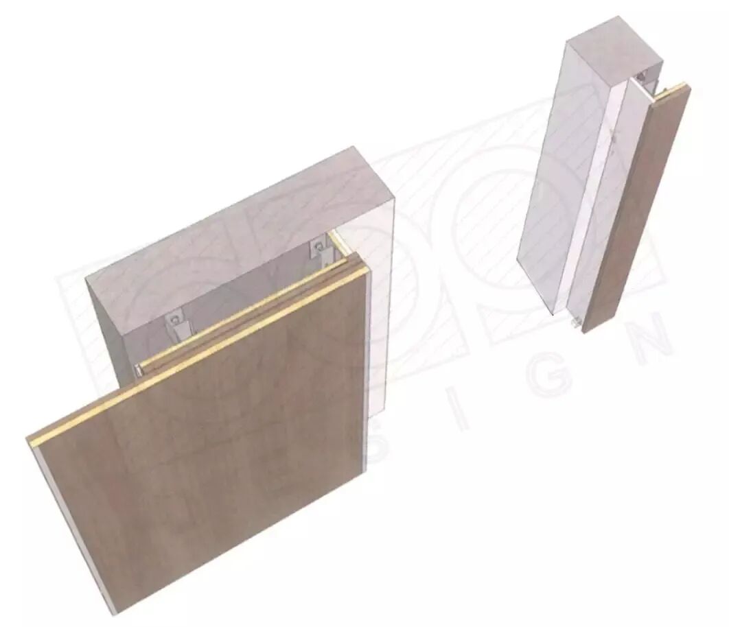 如上图所示,以石材干挂为例,它的门扇部分其实就是周边墙面做法的延伸,周边材料是用什么构造做,暗门扇就用什么构造做。