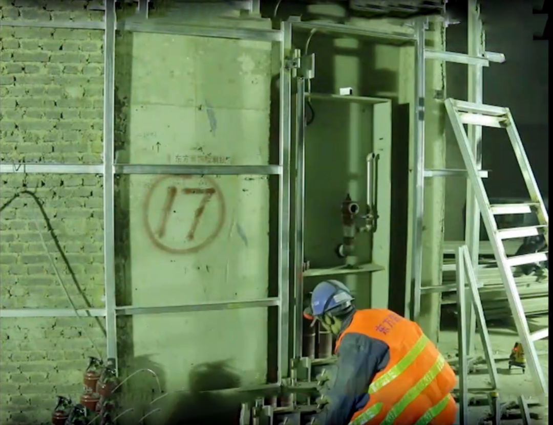 c、现场钢架开启试验:焊接好后要对门进行测试,是否能够顺畅的开启,是否能达到我们要求的开启角度。
