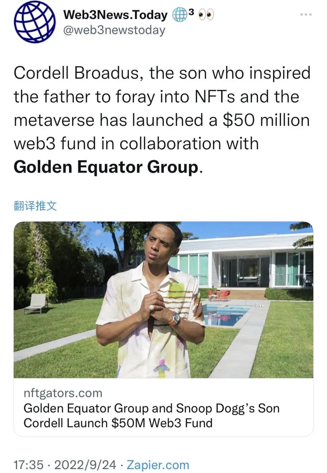 Snoop Dogg儿子Cordell Broadus宣布与新加坡投资机构Golden Equator Group达成合作,双方已成立一支全新Web3基金Welcome To The Block(WTTB)。该基金将募资4000-5000万美元,并计划在2022年底推出,专注于投资CeFi、DeFi和Web3基础设施领域里一些有潜力的早期初创团队,其投资方式主要有三类:传统VC式股权投资、收购项目上市前Token、以及收购已上市的高流动性Token。
