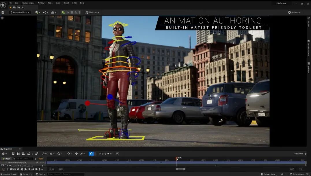 动画极其方便-animation authoring:内置动画工具,可以创建并绑定多个角色模型,同时支持共享绑定,通过调整姿势制作动画。*虚幻引擎ue5