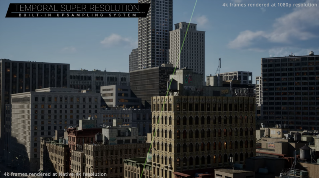 渲染速度非常快-Temporal super resolution:次世代主机有着苛刻地渲染要求,temporal super resolution能够将低分辨率渲染低成本提供高分辨率帧原生4K / 模拟4k(左/右)*虚幻引擎ue5
