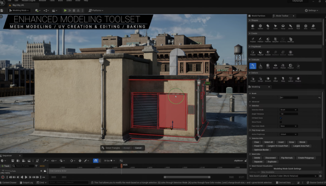 功能非常全面-Enhanced modeling toolset:通过大幅扩充工具集,这些工具可用于编辑网格体、创建多边形,布局和编辑UV甚至进行布尔运算,甚至可以在运行过程中通过脚本实时调整。*虚幻引擎ue5