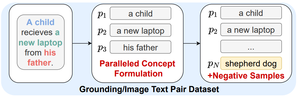2. 由于 grounding 数据以及 image-caption 中数据存在 caption 标注不完全的问题(图片上出现的类别在 caption 中并没有出现),导致训练这些图片的时候可以作为负样本的类别数目极少,进而使得模型对于一些不常见类别的区分度较少。因此我们从物体知识库中随机选取物体名词作为负样本类别,提升模型对稀少类别特征的区分度(+Negative Samples)。