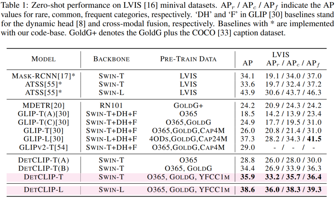 表 1:LVIS 上不同方法 Zero-shot transfer performance 比较