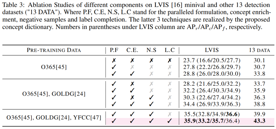 表 3:DetCLIP 在 LVIS 数据集上的消融研究结果