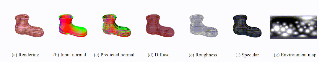 TANGO 能够生成真实渲染结果的关键在于能够精准地把着色模型中的每一个部件(SVBRDF,法向贴图,灯光)拆分开,并分别学习,最后这些拆分的部件再通过球高斯可微分渲染器输出图片,并送到 CLIP 中和输入文本计算 loss。为了展现解耦部件的合理性,该研究对每个部件都进行了可视化。图 2 (a)展示了 “一双砖块做成的鞋子” 的风格化结果,(b)展示了三维模型原本的法向,(c)是 TANGO 对三维模型上每个点预测的法向,(d)(e)(f)分别表示 SVBRDF 中的漫反射,粗糙度和镜面反射参数,(g)是 TANGO预测的用球高斯函数表达的环境光。