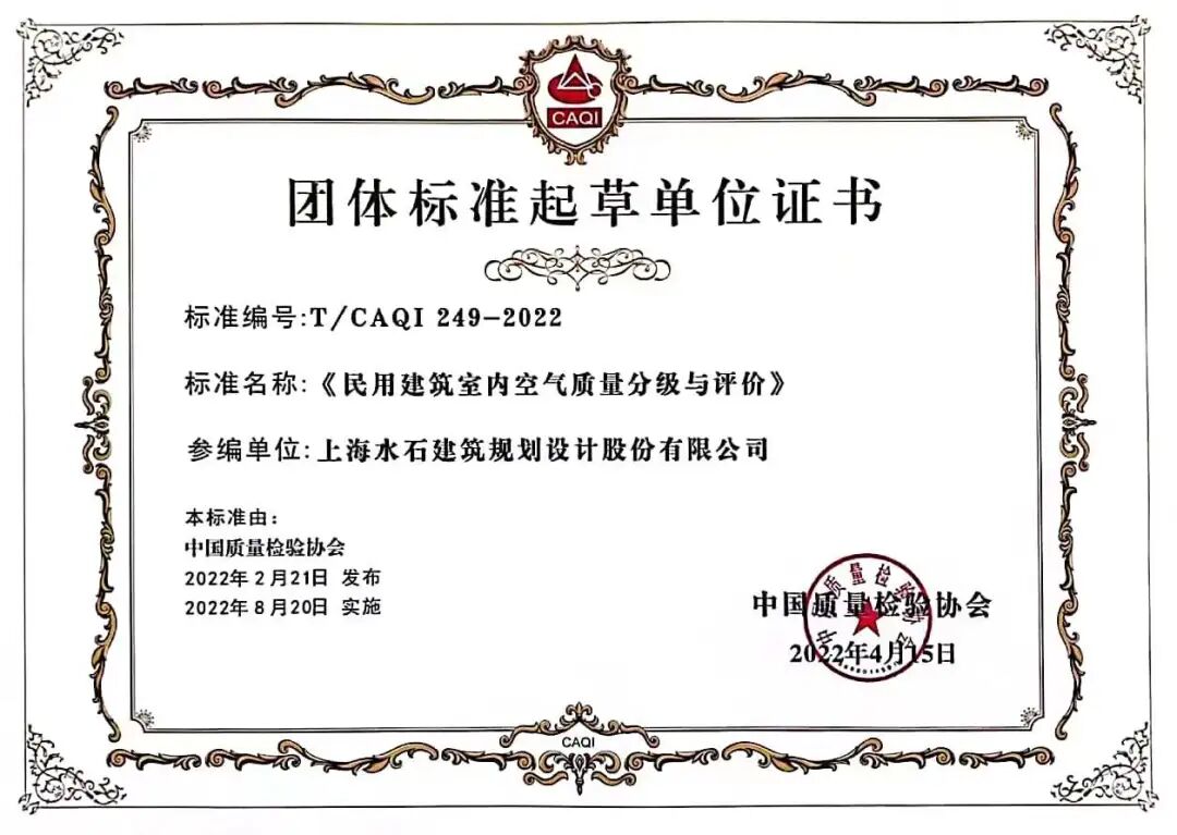 2022年2月21日,T/CAQI 249-2022《民用建筑室内空气质量分级与评价》由中国质量检验协会权威发布,并将于2022年8月20日正式开始实施。水石设计有幸与行业顶尖科研院所及设计院、国内著名高校、行业知名企业、权威检测机构等单位共同倾情编制。该标准的编制旨在打造普及型新概念评价体系,直观科学地体现室内空气质量,彰显环境健康水平,让全社会共同助力建筑价值提升。