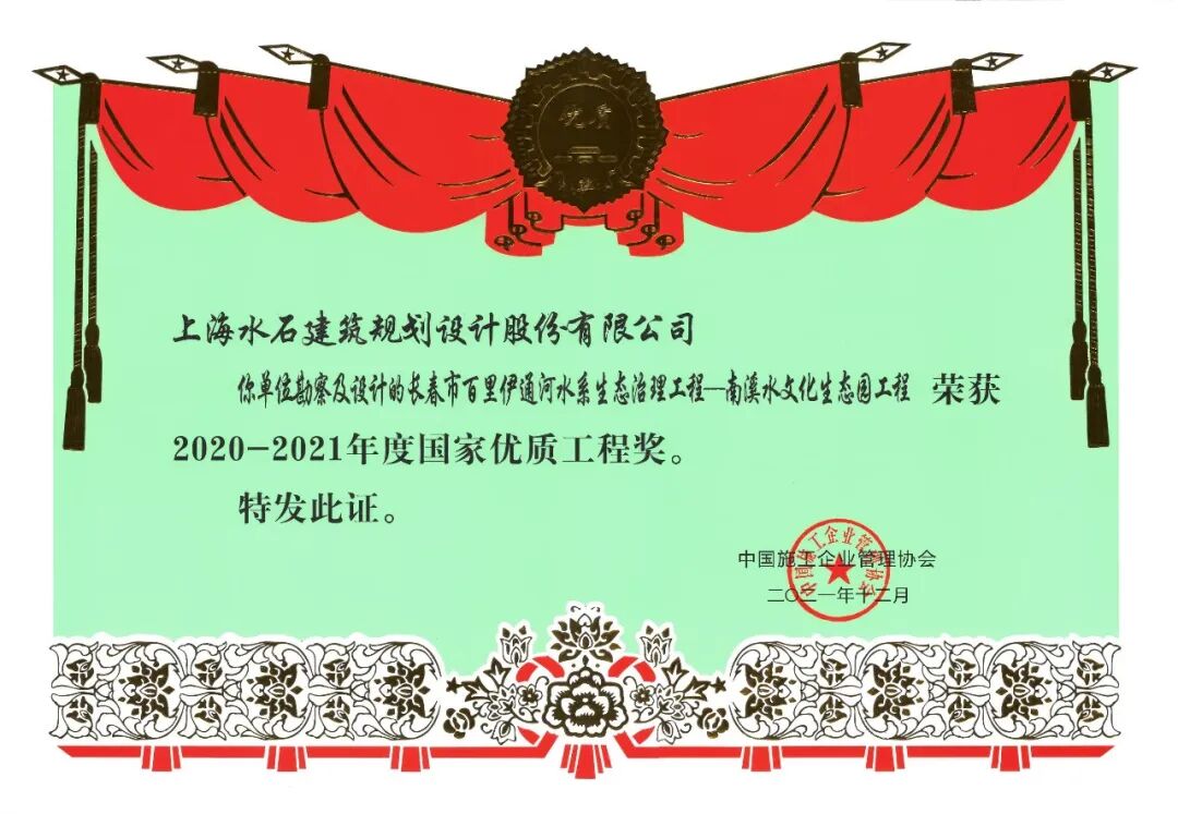 2022年6月26日,由中国施工企业管理协会举办的“庆祝国家优质工程奖创立40周年暨2020-2021年度国家优质工程奖颁奖会”隆重召开。水石设计联合中邦园林勘察及设计的长春市百里伊通河水系生态治理工程-南溪水文化生态园工程”荣获国家优质工程奖。