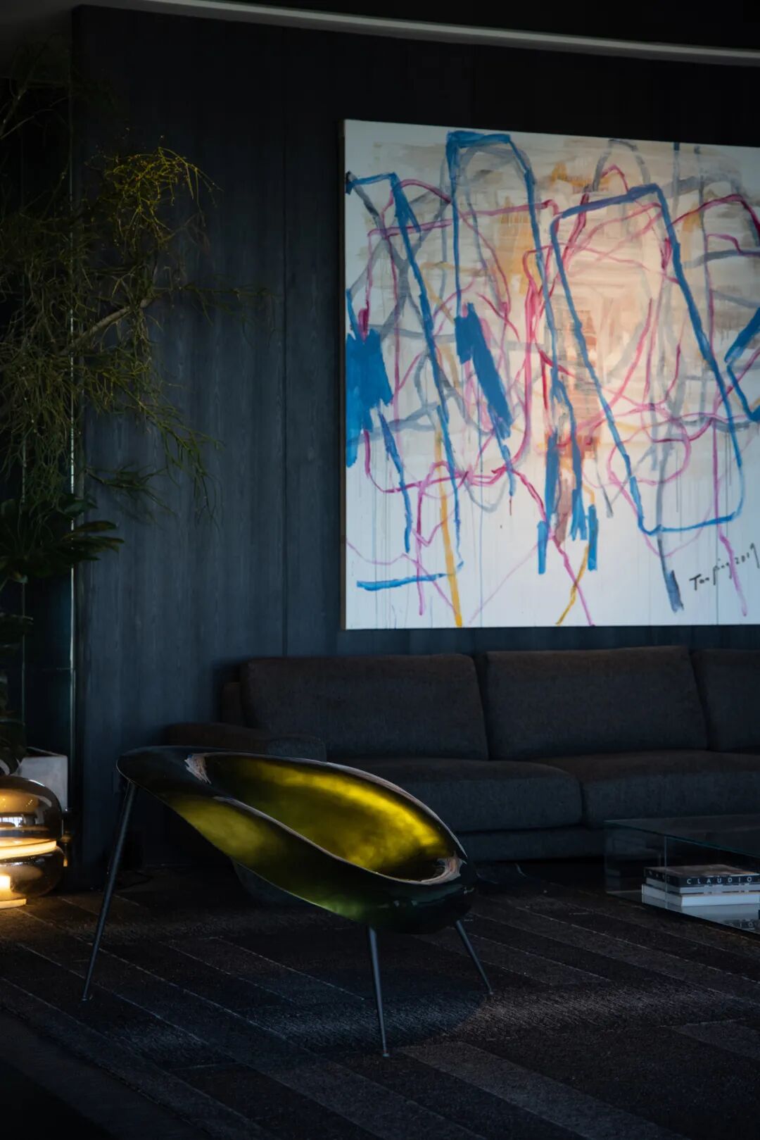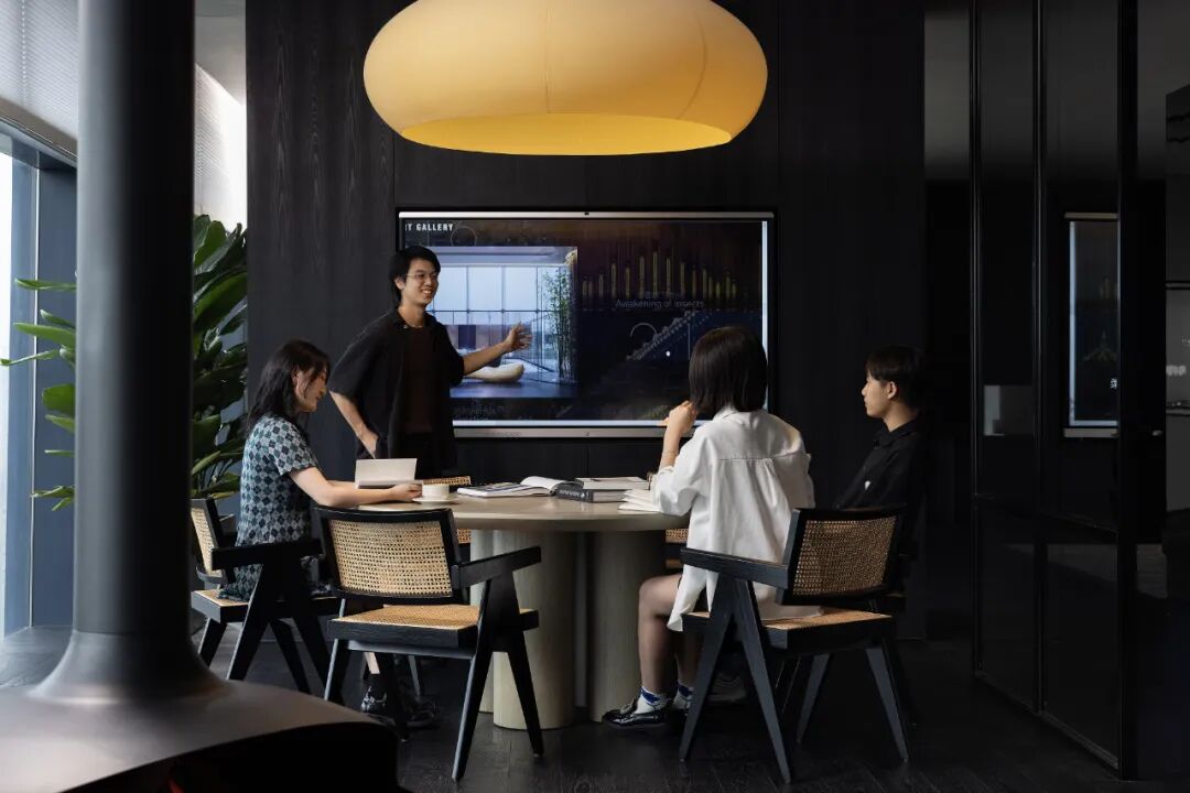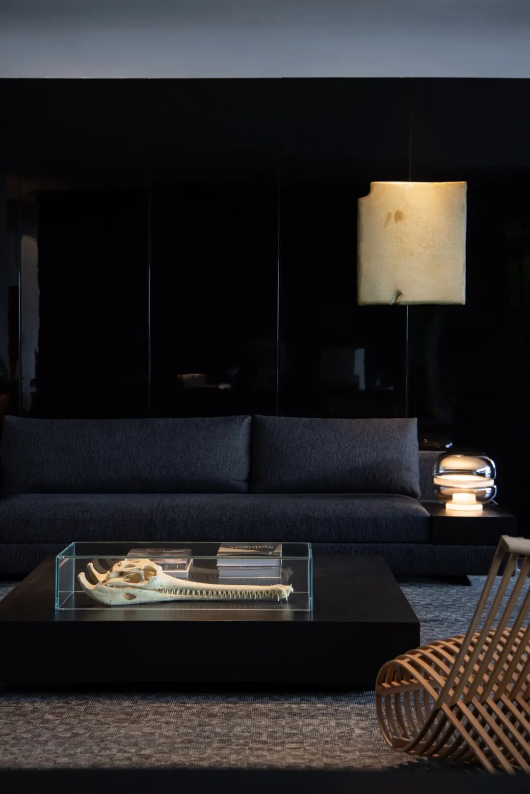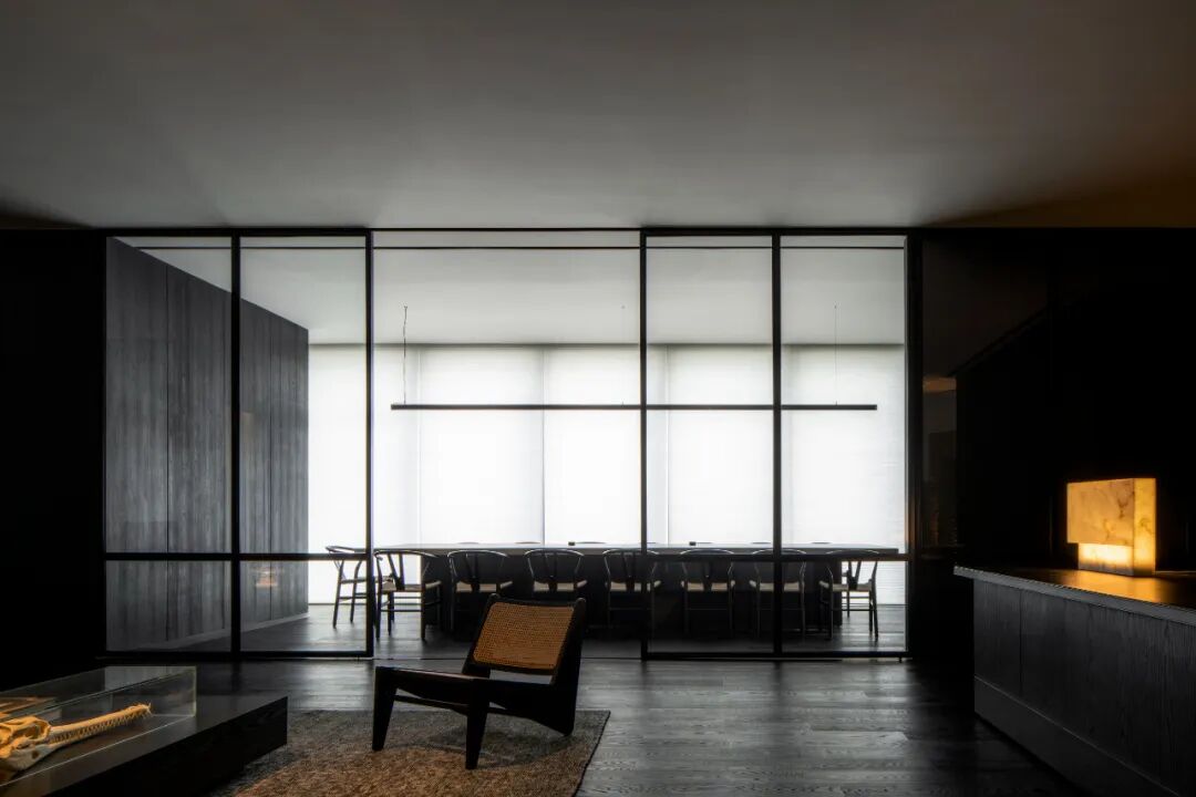 整个场地位于18层,总占面约1600多平,是两块非常狭长的长盒子的垂直拼接。顺着建筑的原始结构,设计将由入口抬升的这块中间区域打造成了开放、共享的公共区域。基于层高与景观面的独特性,空间没有选择常规的白色界面,而是将内部设置为了通体黑色背景的自然消隐,将人们视线的主角,让给落地窗外宽广的景观面。同时,色彩的独特性,叠加材质界面的合理构建,使材料本身互成为这个空间中衬托和表达的个体,在艺术品的力量感中,营造内部界面的丰富感。
