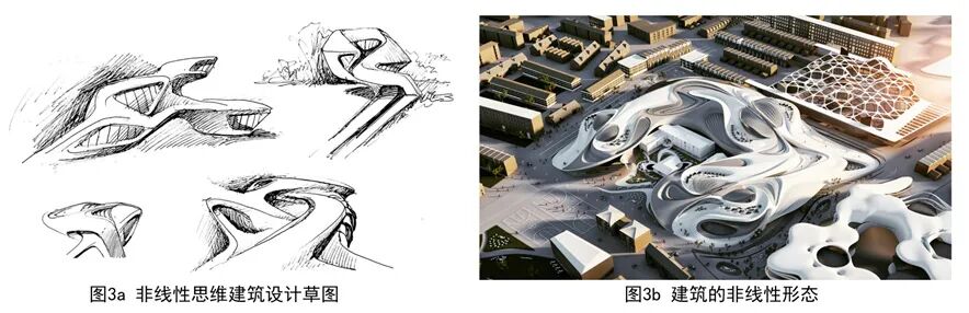 设计师的思维状态影响设计对象的形态、功能和精神内涵,塑造了不同类型的建筑设计作品,是建筑创作的源泉。在非线性思维状态下,设计师想象了建筑的非线性状态,绘制非线性的建筑设计草图(图3a)。复杂的非线性建筑形态(图3b)超出了设计师大脑想象的极限,因此设计师借助计算机技术,辅助建筑建模,形成复杂建筑的非线性形态模型。