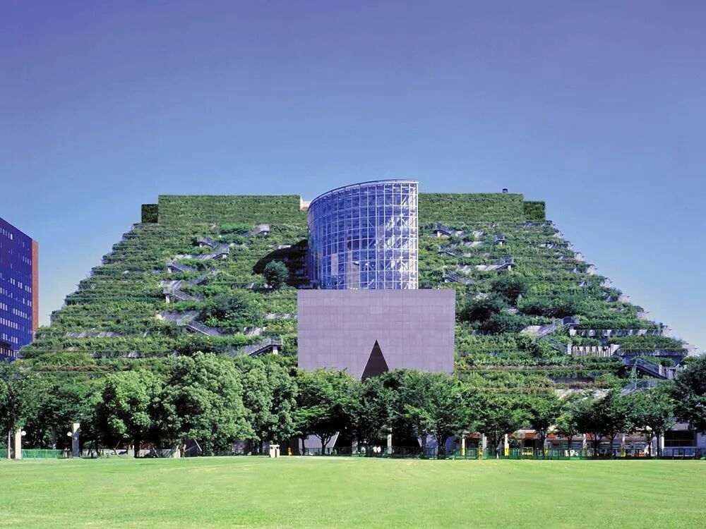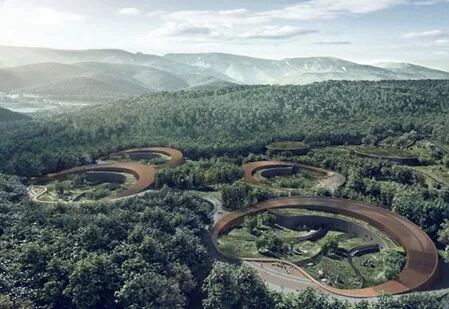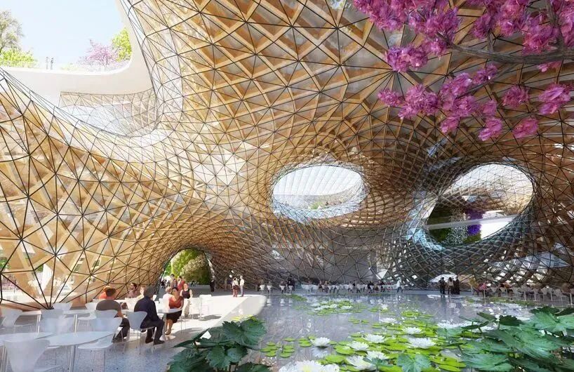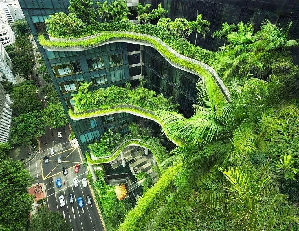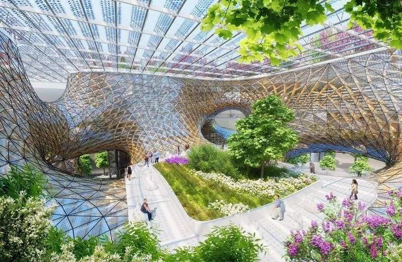 在空中大地上设置溪流、湖泊、瀑布、树林、草地、沙滩、洞穴,以缓坡绿地连接上下层。形成立体穿插的新自然,200%绿化率才叫公园城市。
