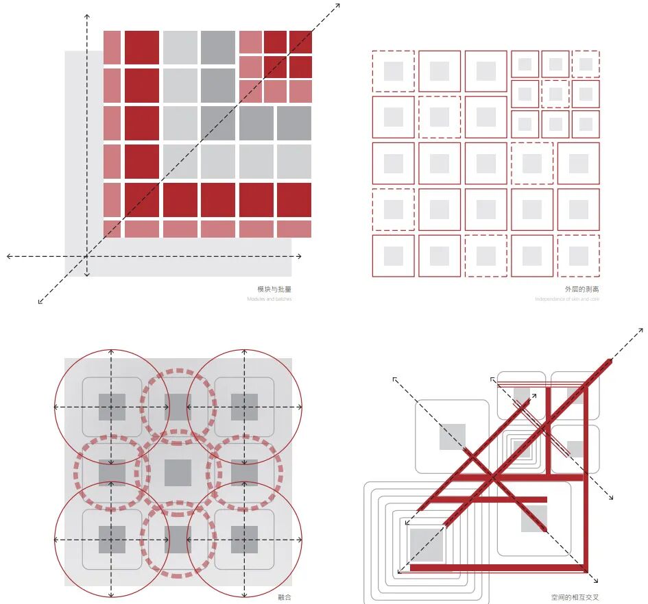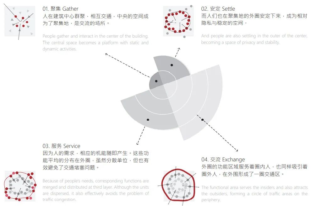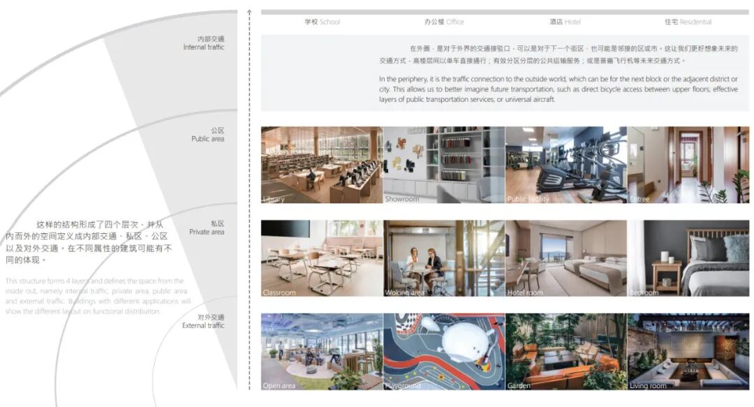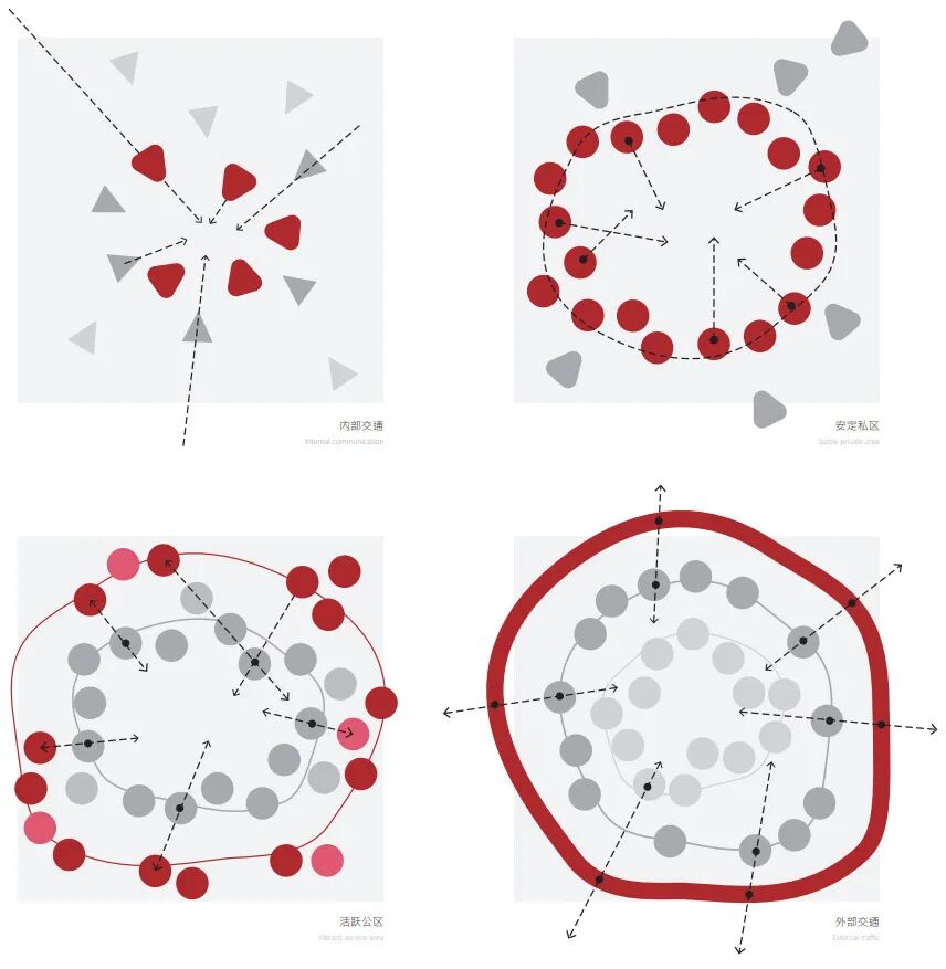这样的结构形成了四个层次,并从内而外的空间定义成内部交通、私区、公区以及对外交通。在不同属性的建筑可能有不同的体现。
