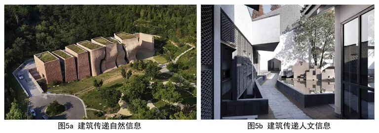 建筑系统表达的信息通过材料、体块、立面和空间构成等建筑媒介来传递,影响人们的感觉、知觉系统,让人们认识并理解建筑表达的深层含义。图5a体现了建筑对自然信息的传递,通过岩石体块塑造、地方材料的运用,表达了建筑形态的自然属性,展现的建筑与自然大地的相互融洽。图5b体现了建筑对人文信息的传递,通过折曲多变的空间、地方传统建筑材料等,表达了建筑空间的文化属性,展现并延续了地方建筑文化。