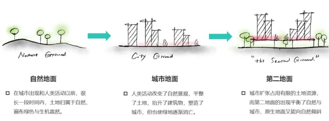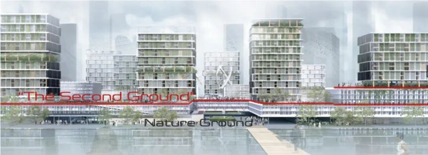 第二地面即自然地面(第一地面)之上一个层级的地面,通过建筑方式在垂直方向再造地面,旨在解放自然地面空间。