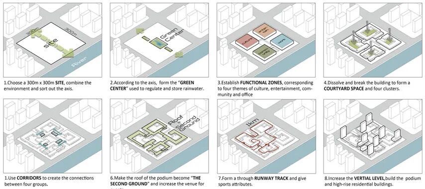 “空中大地”是一个系列理念,可以单独成立,也可以包含空中大地、再造自然、漫山庭院、屋顶互连、纵横镂空5个支点: