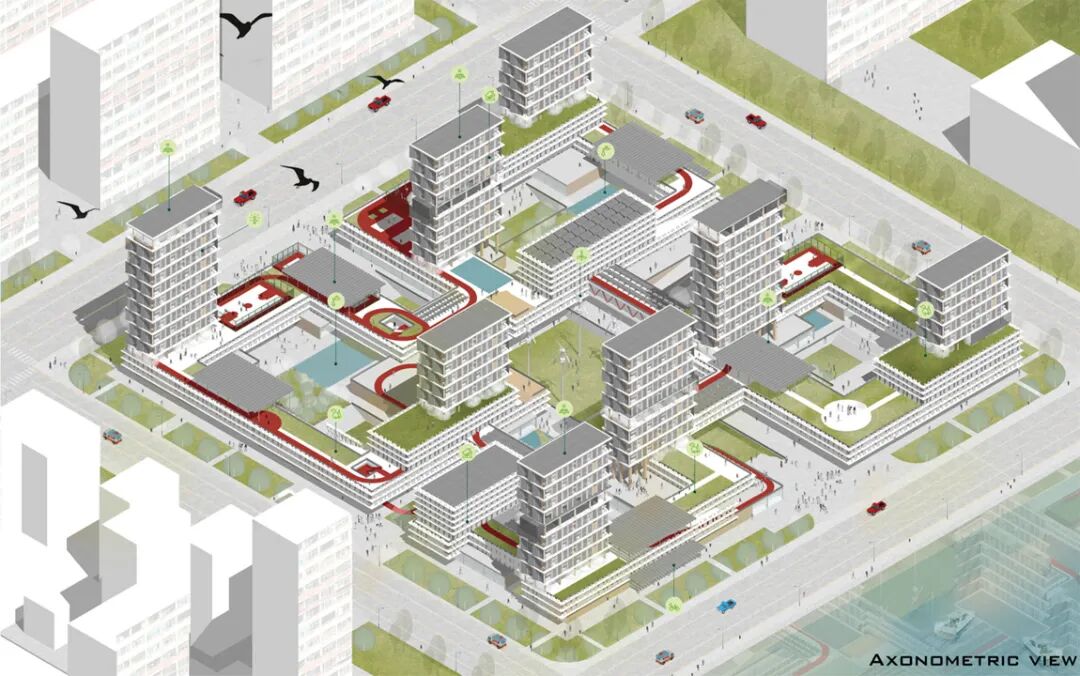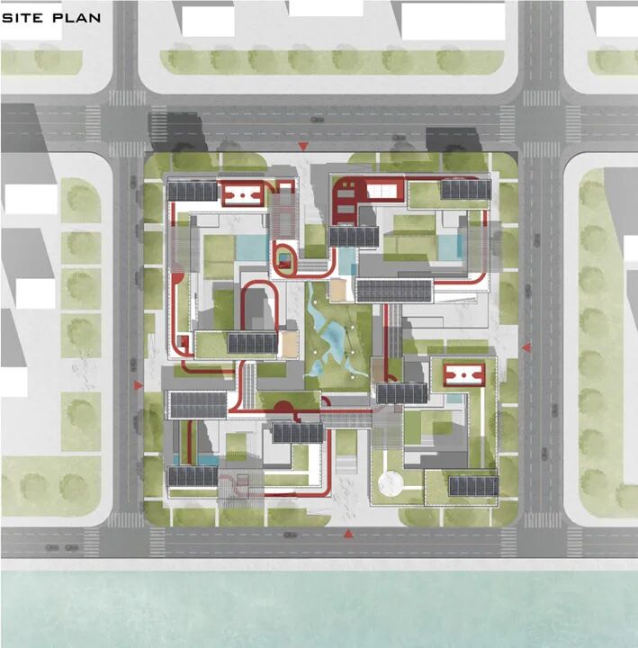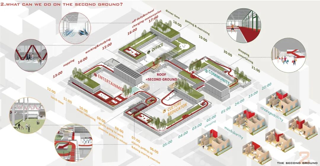 本方案是一个以第二场地为主要概念的未来社区设计案例。第二地面在方案中承担释放地面空间和增加活动场地的双重作用。