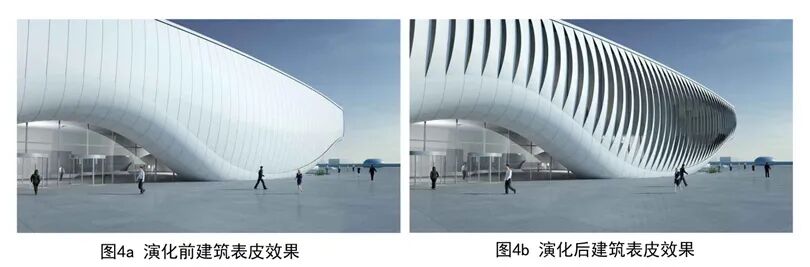 4表现了建筑表皮通过动力系统进行演化的过程,体现了建筑系统的环境适应性。在图4a中,立面薄片呈现闭合状态,限制了建筑系统与环境的能量交换,阻止了环境温度、风速和照度对建筑内部的影响。在图4b中,立面薄片呈现开敞状态,提升了建筑系统与环境的能量交换,借助室外温度、风速和照度改善室内环境,减少建筑能耗。