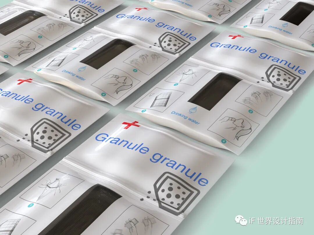 服用颗粒状药物时,病人通常需要水、杯子和搅拌棒。在许多情况下可能很难找到干净的水和干净的纸杯或玻璃杯。这种巧妙的包装设计包括一袋水和用自封条隔开的一袋颗粒状药物。病人只需拉开自封条,让水和药物混合,用力摇晃后撕开包装即可服用。操作过程简单方便,在紧急情况下简直就是救命稻草。