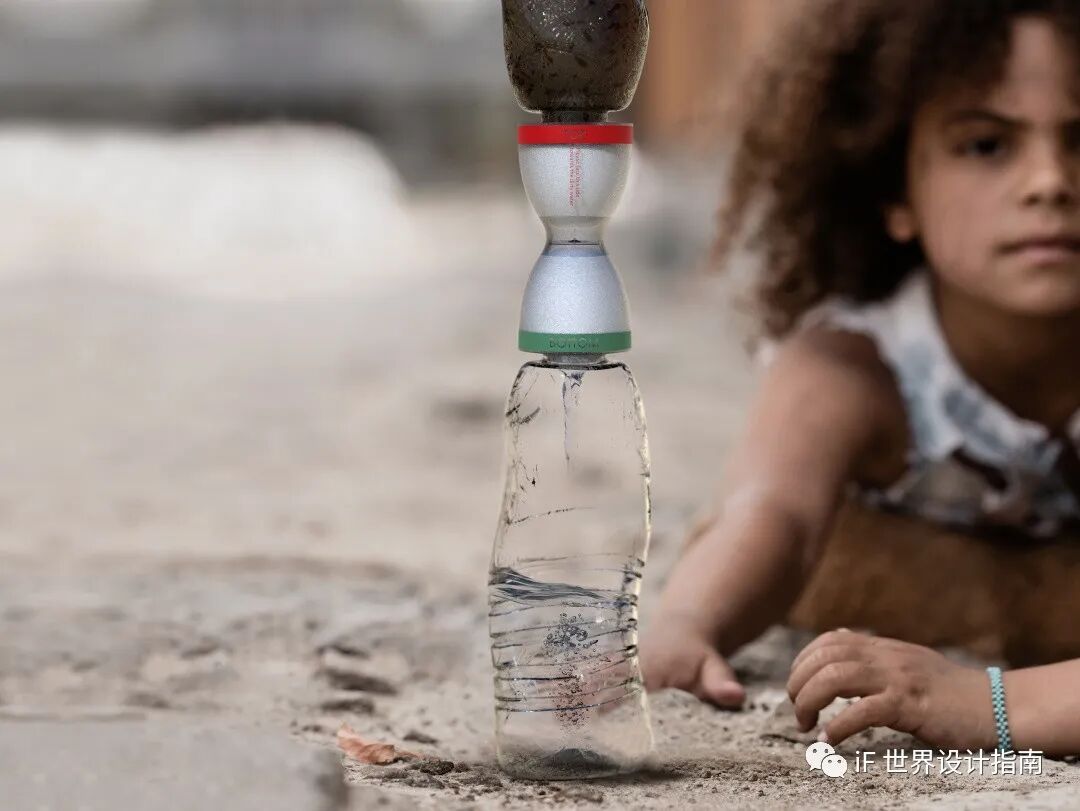 “在众多关于水净化的项目中,该方案在两个方面非常突出。首先是它具有对塑料水瓶的兼容性。这为一个有争议的产品提供了一种聪明的二次利用,并消除了制造额外的特定产品容器的需要。其次是它的沙漏外观和颜色搭配,优雅地表达了一个简单的自上而下的净化过程。”
