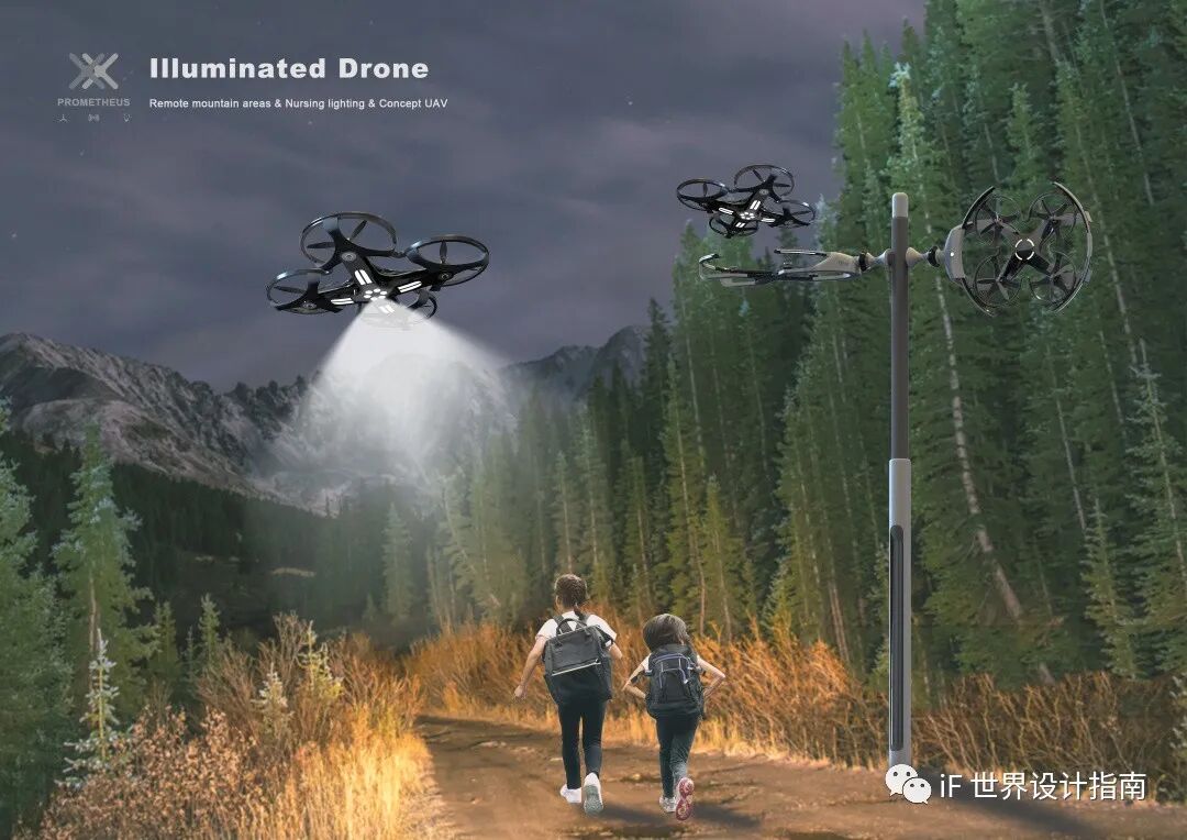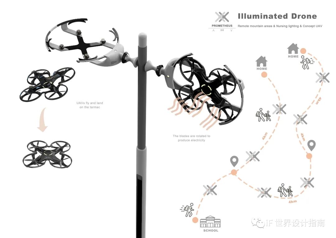 该产品是为偏远山区的人们夜间行走设计的照明解决方案,在偏远山区夜间行走存在许多不安全因素,包括野生动物和道路两侧突发落石。照明无人机通过护送步行者解决了这个问题。照明无人机配备太阳能和风力发电设备;当风穿过风扇叶片时,无人机就会发电,这也解决了偏远地区无人机充电的问题。