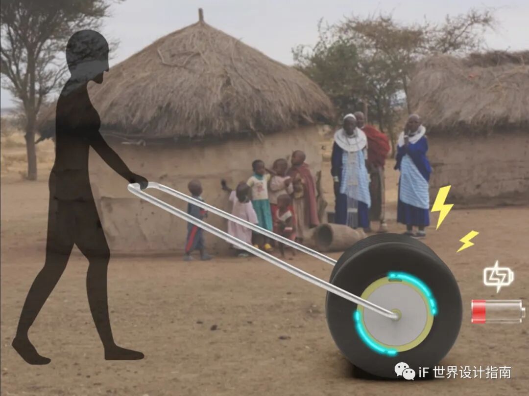 非洲数以亿计的人要么无法接入电网,要么经常面临电力短缺。河马水辊(Hippo roller)是解决运水问题的创新方案,已有数以万计的河马水辊在非洲使用。取水往返路程通常需要4个多小时。这种设计在河马水辊的基础上进行了改进,在外部增加了一个小功率发电机。这样,发电机能够在取水的过程中产生足够的电力,用于家里的夜间照明。