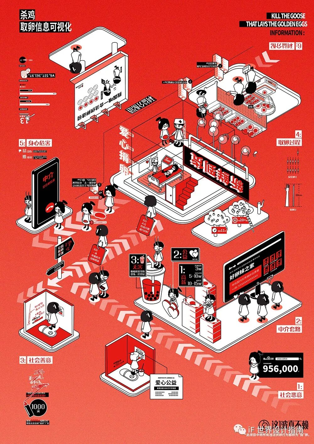 该平面设计形象化地展示了中国人体卵子地下交易现象,并提高人们对这种行为对女性身心健康造成的潜在危害的认知。该流程图平面设计采用了两种不同的视角来揭示非法捐卵的风险。
