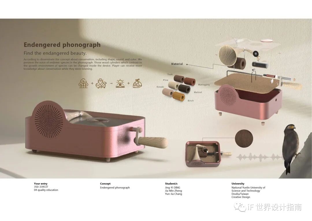 这一设计是为了提高人们对保护濒危鸟类的认识。此类信息通常是通过文字、图像或电影来传递的,但这些媒介并不一定能充分传达野生动物的独特价值。此装置的设计模仿复古留声机,保存了特有鸟类的叫声与歌声。由于使用了木质圆柱体来播放不同的鸟鸣,此装置具有强烈的触觉和视觉元素。