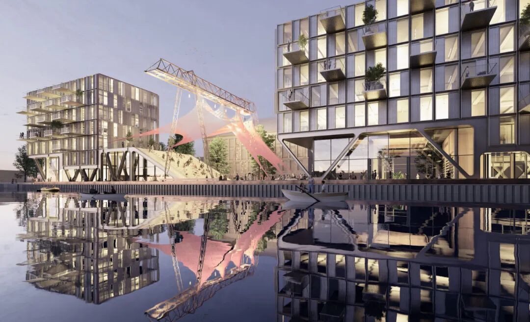 在新克尔恩航运运河畔的这个独特位置,现场有两台历史悠久的龙门起重机,他们正在开发分布在三座建筑中的商业阁楼和社区空间。