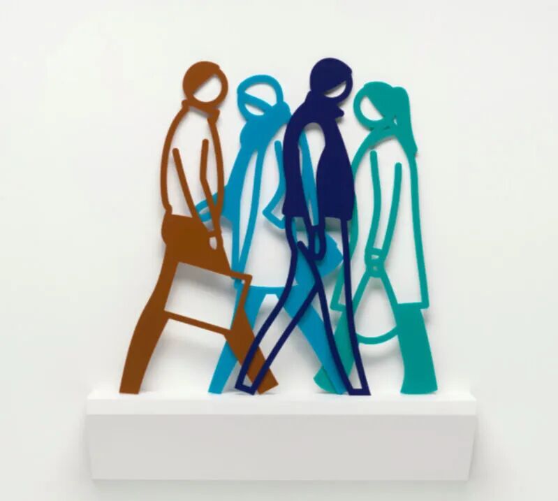 Wall mounted corian shelf with four freestanding acrylic sculptures