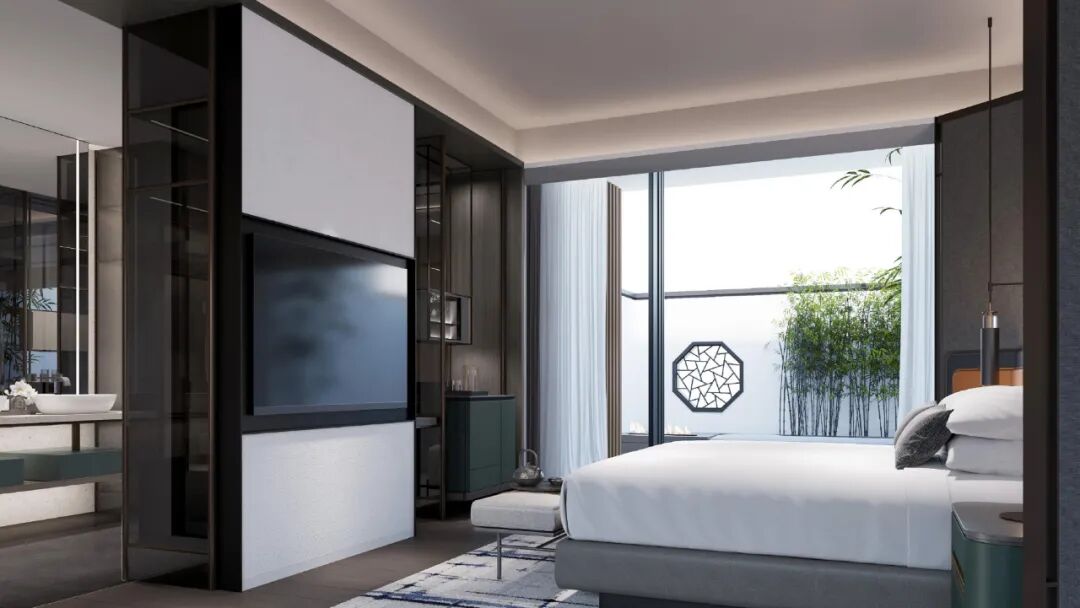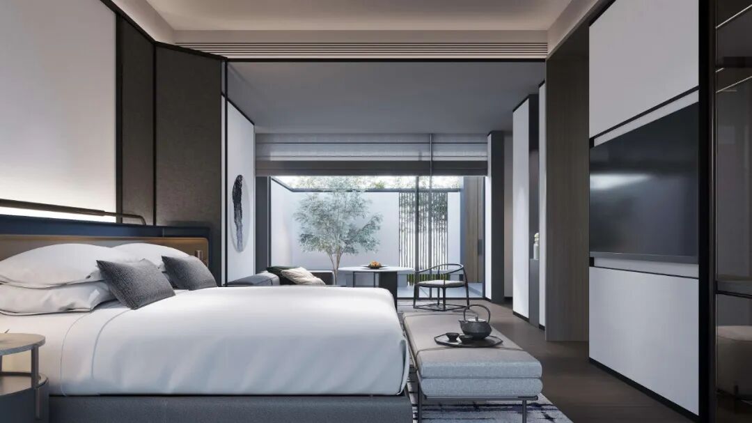 客房则融入了江南宅院风格,和精雕细琢的室内设计,并巧妙融入中式文化中经典的“留白”写意首发,以景写形,以形抒情居于此地,宛若打开了一扇通往江南风情的大门。