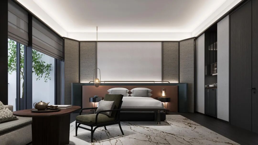酒店拥有⼭⽔、禅意等共计150间左右融合中国传统文化设计而成的客房及套房,房间细节处巧妙构思,与现代时尚结合,充满艺术格调。