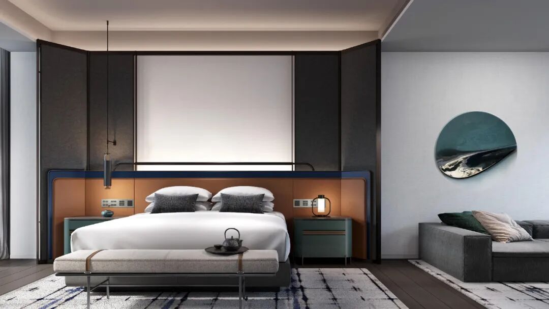 宁波湖畔凯悦尚萃酒店计划在2022年开业,酒店位于宁波镇海区同心湖,酒店室内设计由著名的设计师担纲。酒店共有174间客房,室内空间应景地以湖蓝为主色调,床头背景则是一道雪白的砖墙,并搭配了不对称的床头灯。沙发休憩区则用艺术画作作为点缀,充满艺术感。