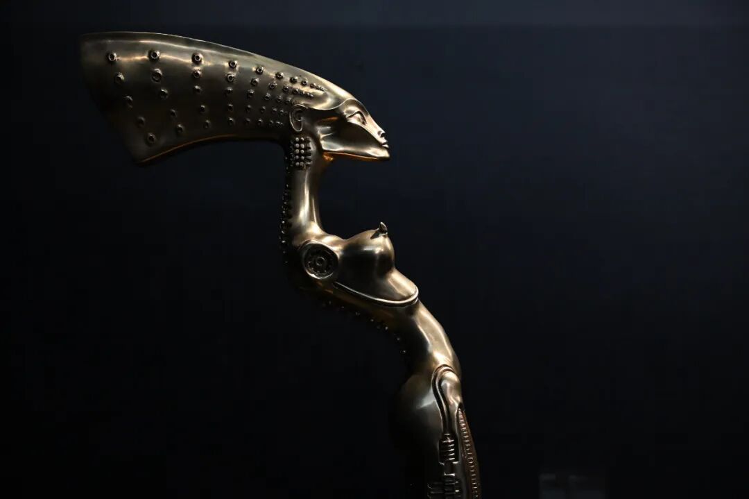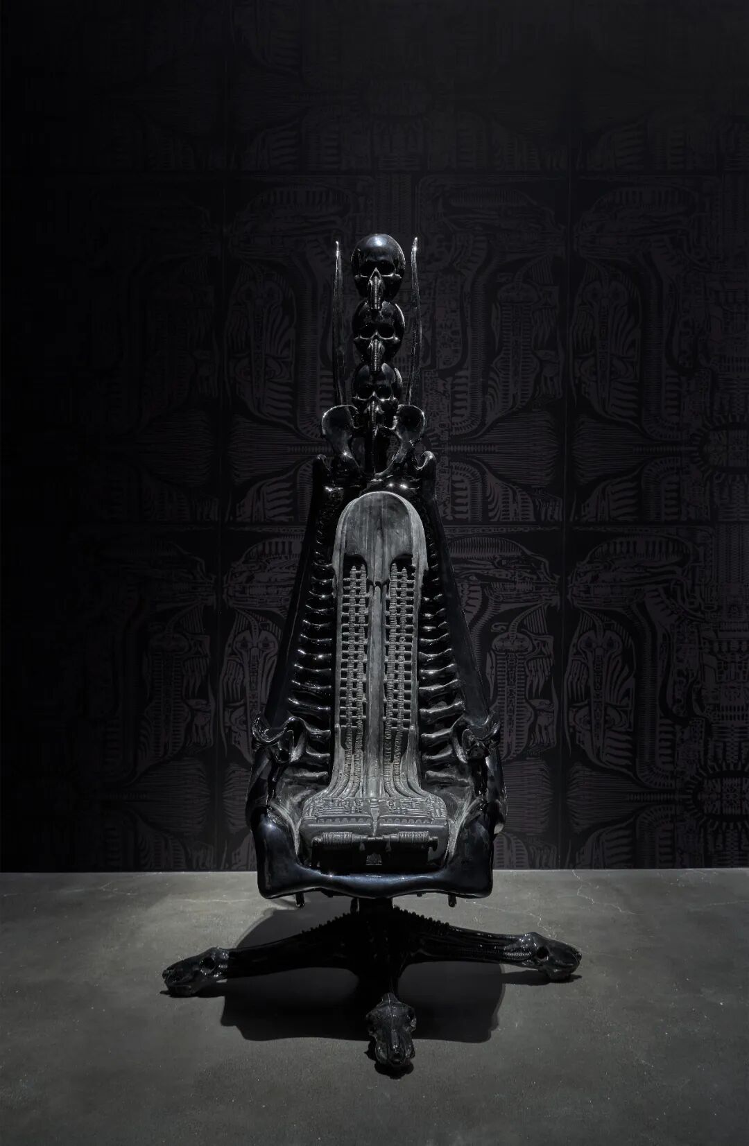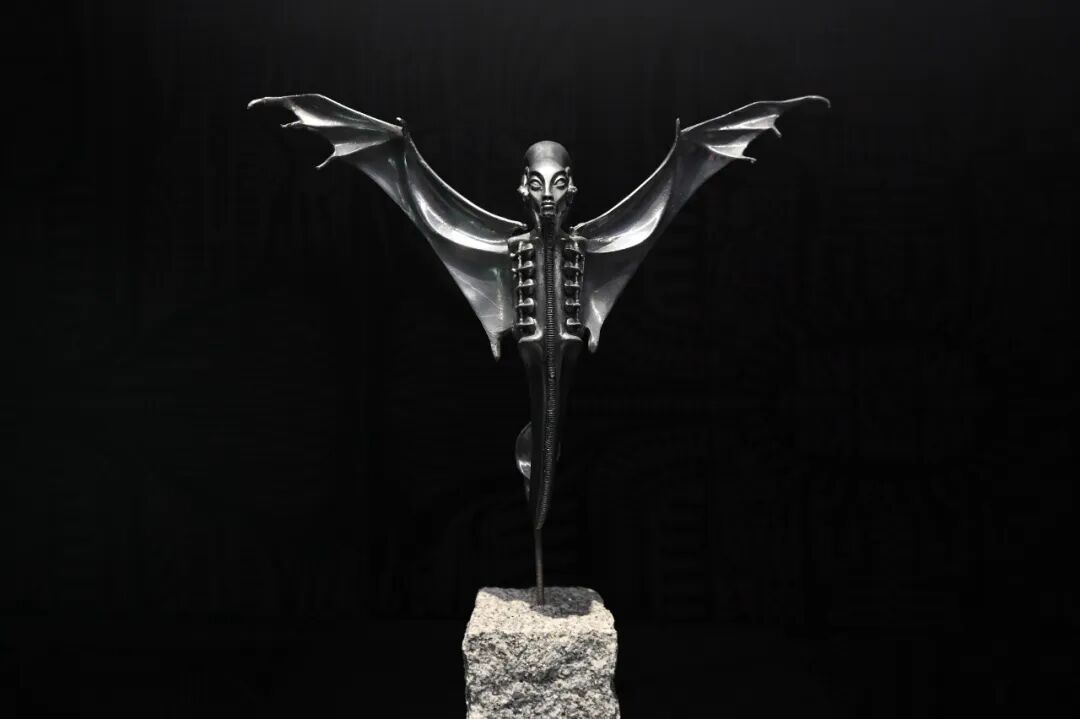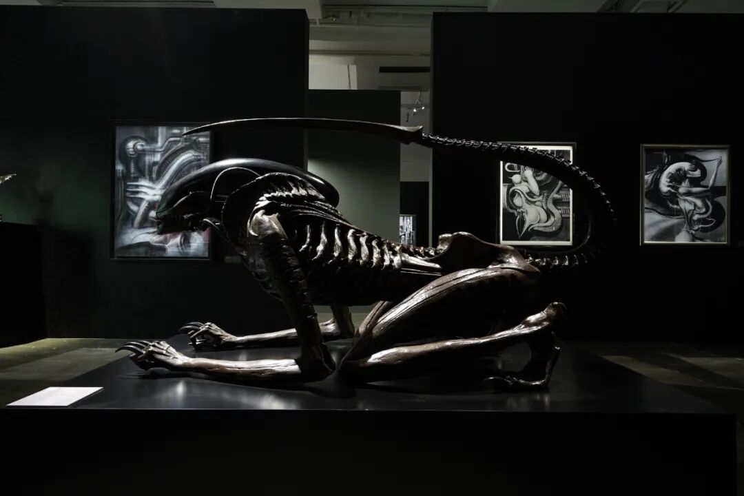 这座雕塑最初是吉格尔为大卫·芬奇的科幻电影《异形3》(1990)设计的新异形,艺术家在2005年重新设计并完成了它的第二形态。根据他之前为电影《异形》(1979年由雷德利·斯科特执导)设计的第一版异形形象,吉格尔对其进行了改良:取消背上无用的管道,增加剃刀般锋利的狮爪,舌头的造型类似于长矛,给人以致命之“吻”的视觉冲击,整个作品以更加有机的设计概念呈现优雅与诱人的生物机械美学。该作品亦揭示了洛夫克拉夫特(H.P. Lovecraft)创立的神话体系“克苏鲁神话”对吉格尔的影响,吉格尔在1977年出版的第一本大型画册就是以他的小说集《死灵之书》(Necronomicon)命名,如书中所示,“死灵之书”具有死亡和永生的双重含义。
