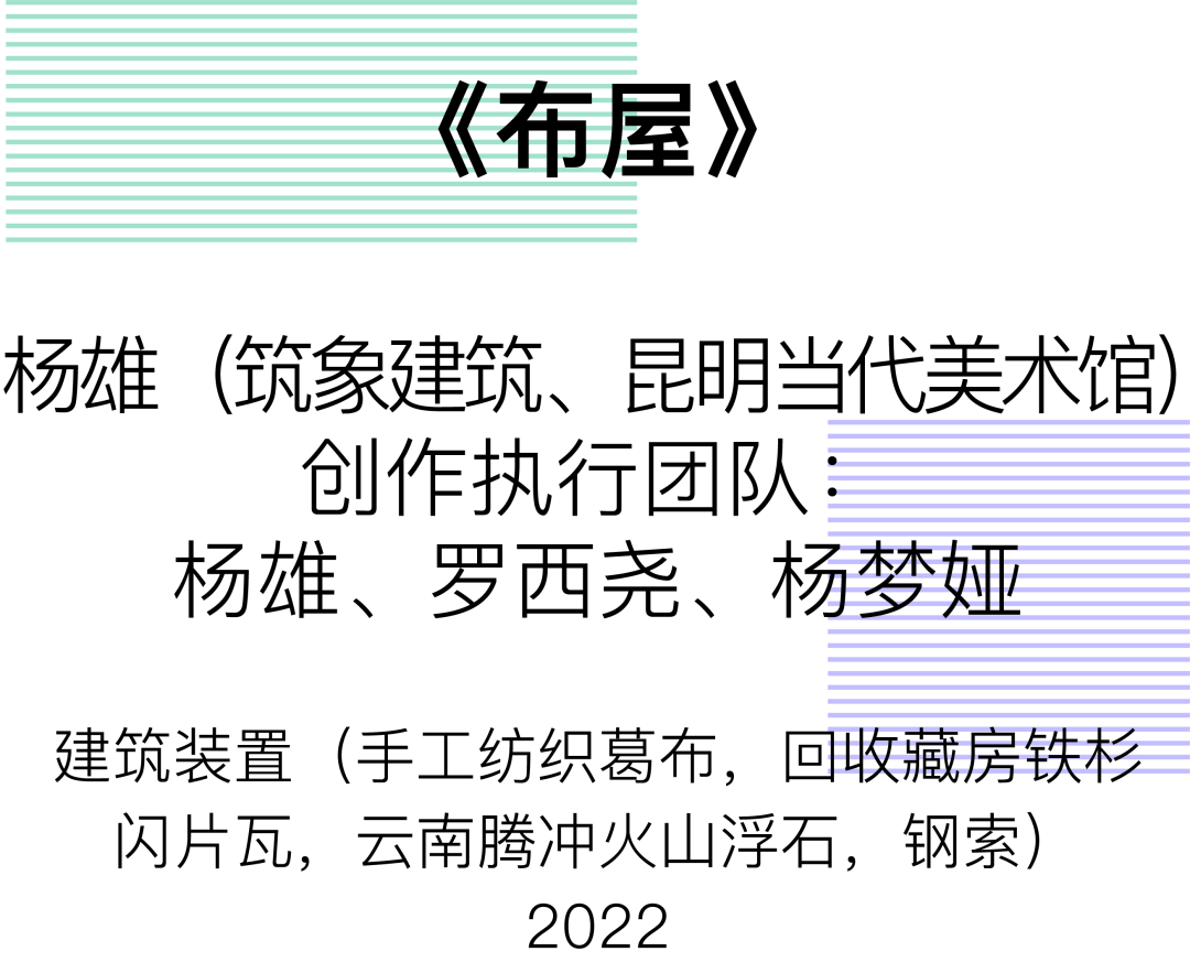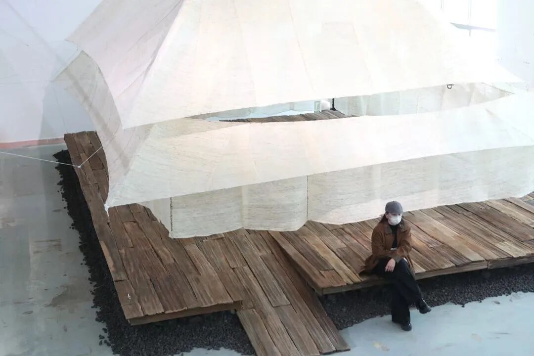 作品以云南省滇西南地区民居“竹楼”为母题,以古老的葛布相互缝合形成“屋面”,借力多角度牵引的钢索结构张拉出一座悬浮在空中的“布屋”。