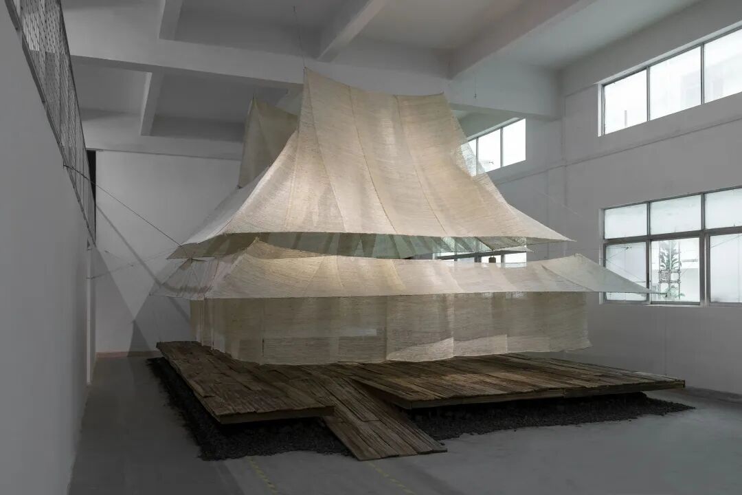 经纬交错的织布形成虚空无柱的屋檐,编织的屋檐限定出一个我们与人、事、物相遇的空间。而在经纬线结束后看不见的地方,延续着人们关于某个确定的“传统”的遥想。传统的“家园”被各方外力牵引,拉扯出一个想象中的乌托邦景象:一座飘浮在空中的海市蜃楼般的“家园”。