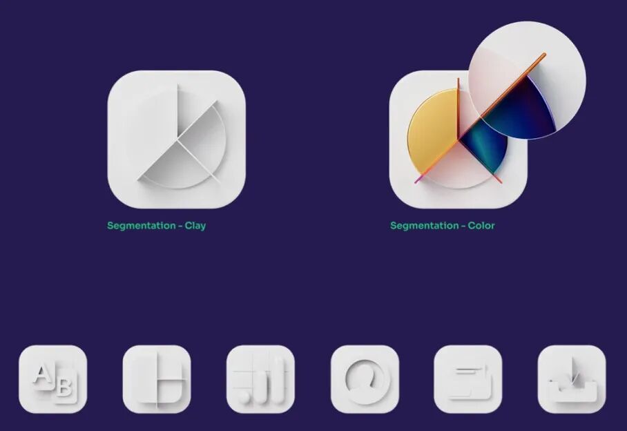 也可以在渐变里面增加一些立体感和厚度,让整体色彩更丰富,更有活力。或者增加一些磨砂透明效果,让图标丰富起来。这个风格大家在项目改版和作品集改版都可以大量去尝试。随着iOS暗黑模式的运用,这种渐变风格在深色底上运用就更游刃有余了。