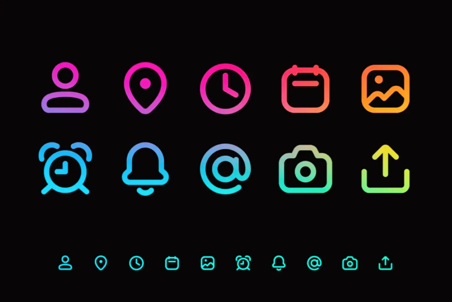 渐变图标这两年一直很火,无论品牌、平面还是UI。渐变让扁平变的更有趣、更活跃。也能在一堆纯色,扁平设计里面脱颖而出。很多企业也开始尝试渐变图标了,像google和阿里这样的公司已经加入了这一潮流。渐变的图标运用到暗黑模式就特别适合,能让页面潮起来,增强图标品牌感。