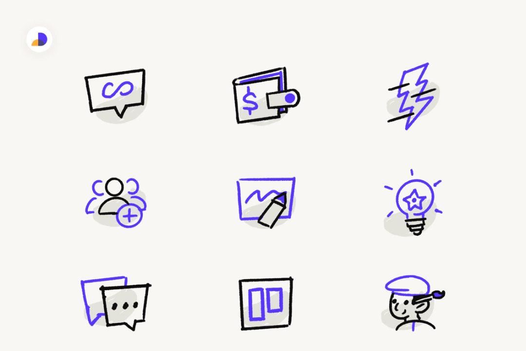 手绘图标使用的场景也比较多,无论用在网站,空白页,还是当插图都是可以的,你可以通过改变线条,粗细,形状,通过这些调整,然后找到符合你们界面调性的图标。也可以做成贴纸周边去运用,特别有亲和力,让品牌也生动起来。