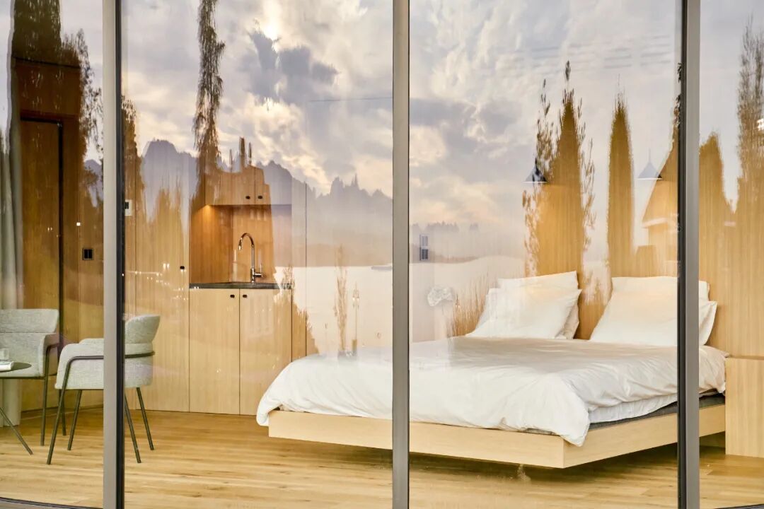 半透明的外墙包裹着轻盈的室内空间,使用的是聚碳酸酯材料,这是一种工业化的、重量轻的、灵活的和可回收的材料,这种材料的半透明性在历史和现代、重和轻、热和冷之间创造了一种对话与对比。