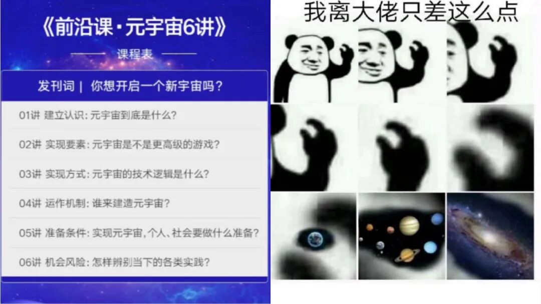 也有人在年初立下创业的flag,扬言要抓住行业新风口。年末刮起了一阵元宇宙的风,Facebook改名meta,机会来了。一边拿着99元买来的宇宙入门课程,一边排着队准备起飞了。