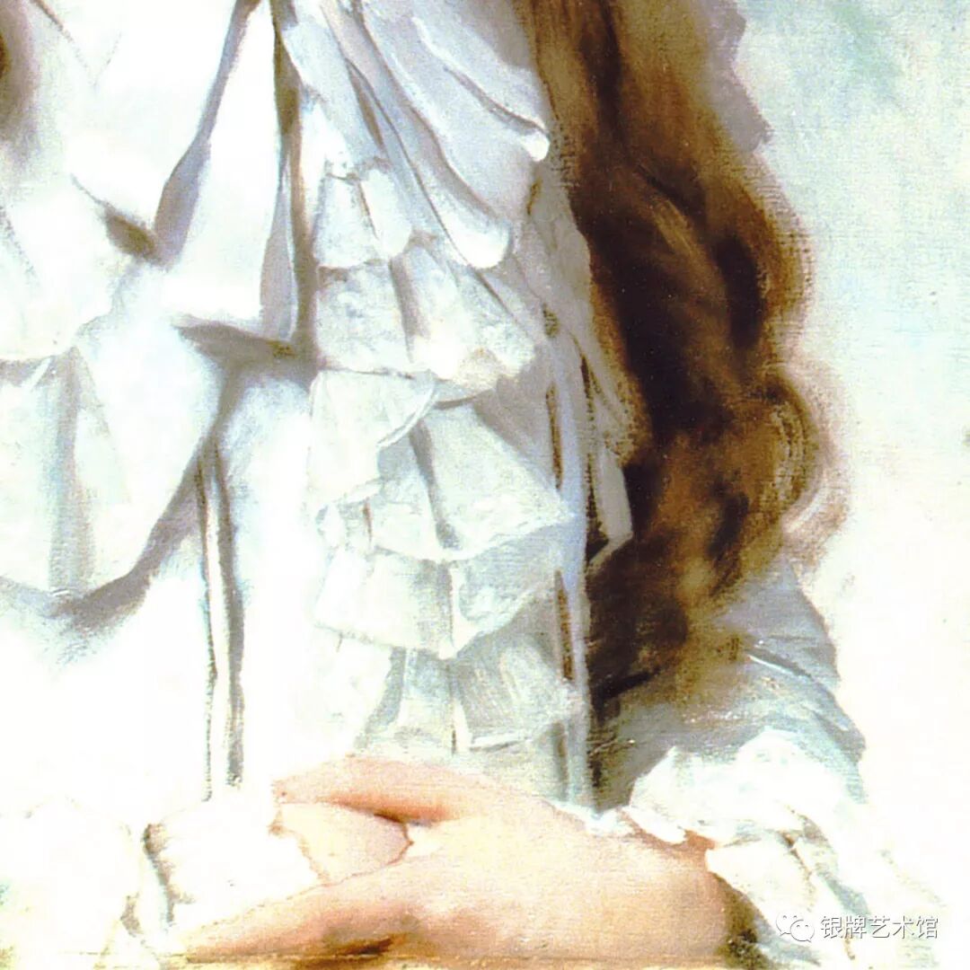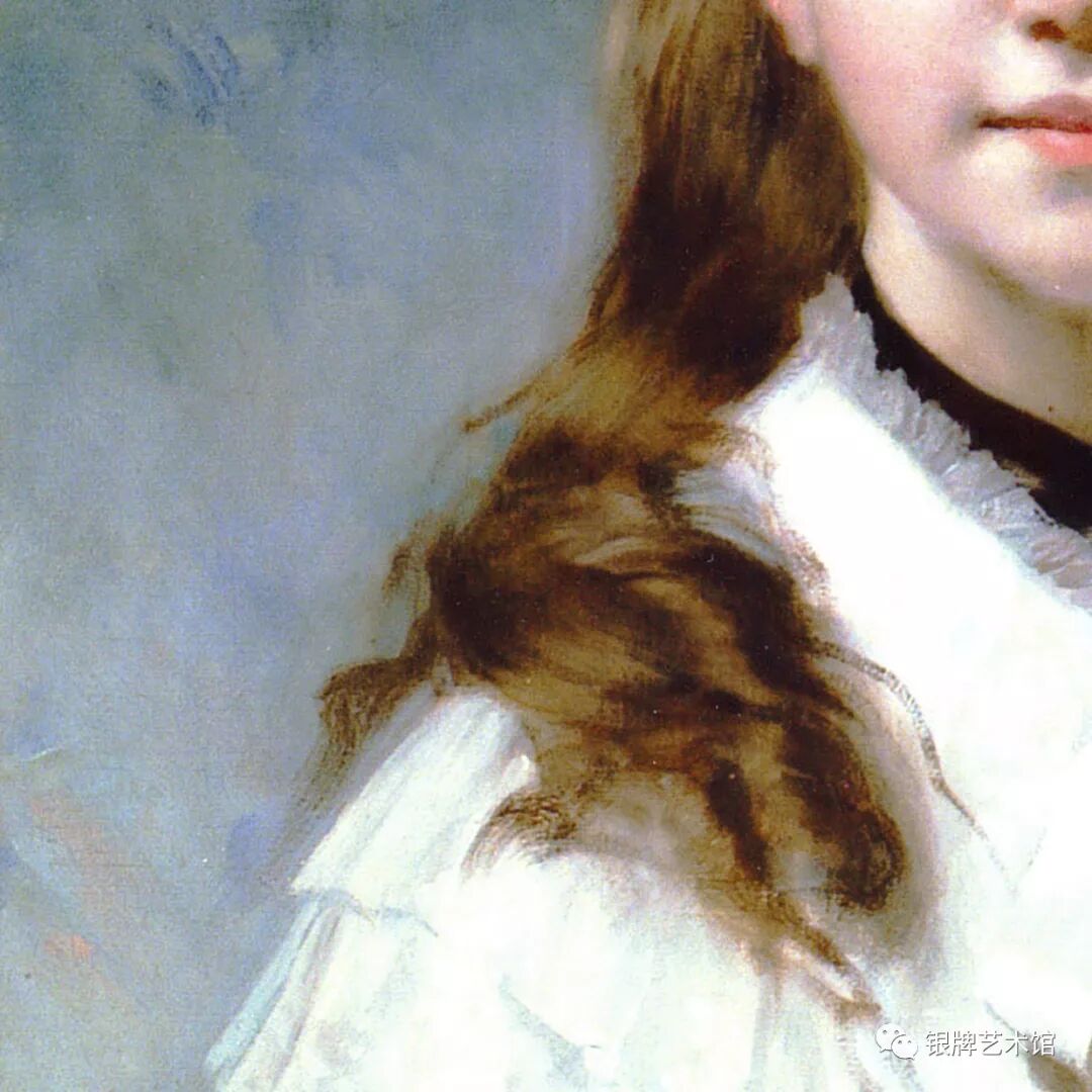 她穿着带有皱褶白色上衣,黄色长发象瀑布一样从双肩倾泻而下,卓别林通过运用玫瑰色和浅灰色的微妙色调,描绘女孩带有珍珠色泽的肤色,画中女孩脸蛋红润,眼神专注,整体构图清新自然。